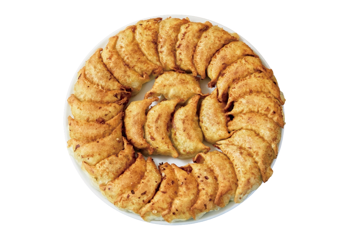 創業者の菅野かつゑさんが満州で見た、水餃子を中華鍋にびっしりと並べて焼き付ける“鍋はり”といわれる姿が、この店の始まりであり円盤餃子の源。現在は孫の椎野仁子さんが味を守り、行列客を受け入れている。26cmのフライパンに敷き詰める餃子は、薄めの皮に白菜を主体にした餡を詰めて軽やか。均一な焼き目が職人技の証だ。