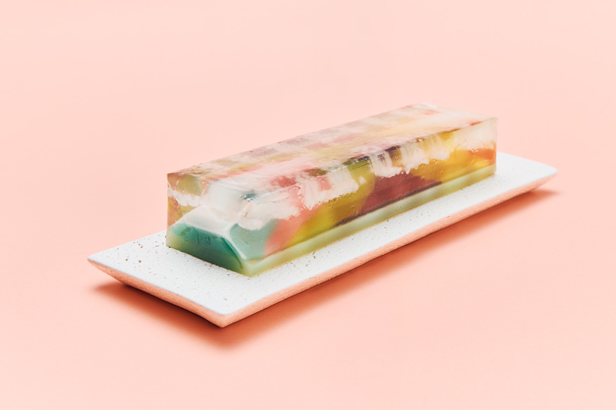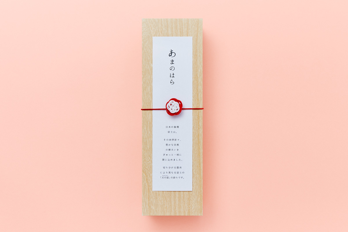 四季のうつろいを一棹で表し、切り分ける箇所により富士山の表情が変わるのが特徴。春はピンク、夏は緑、秋はオレンジ、冬は青など、ふたつとして同じ色合いにはならない。山の部分は煉羊羹、空は錦玉羹、そこに浮かぶ雲は道明寺を用い、ほのかにレモンが香る爽やかな味わい。お祝い事の際の手土産にぴったりだ。