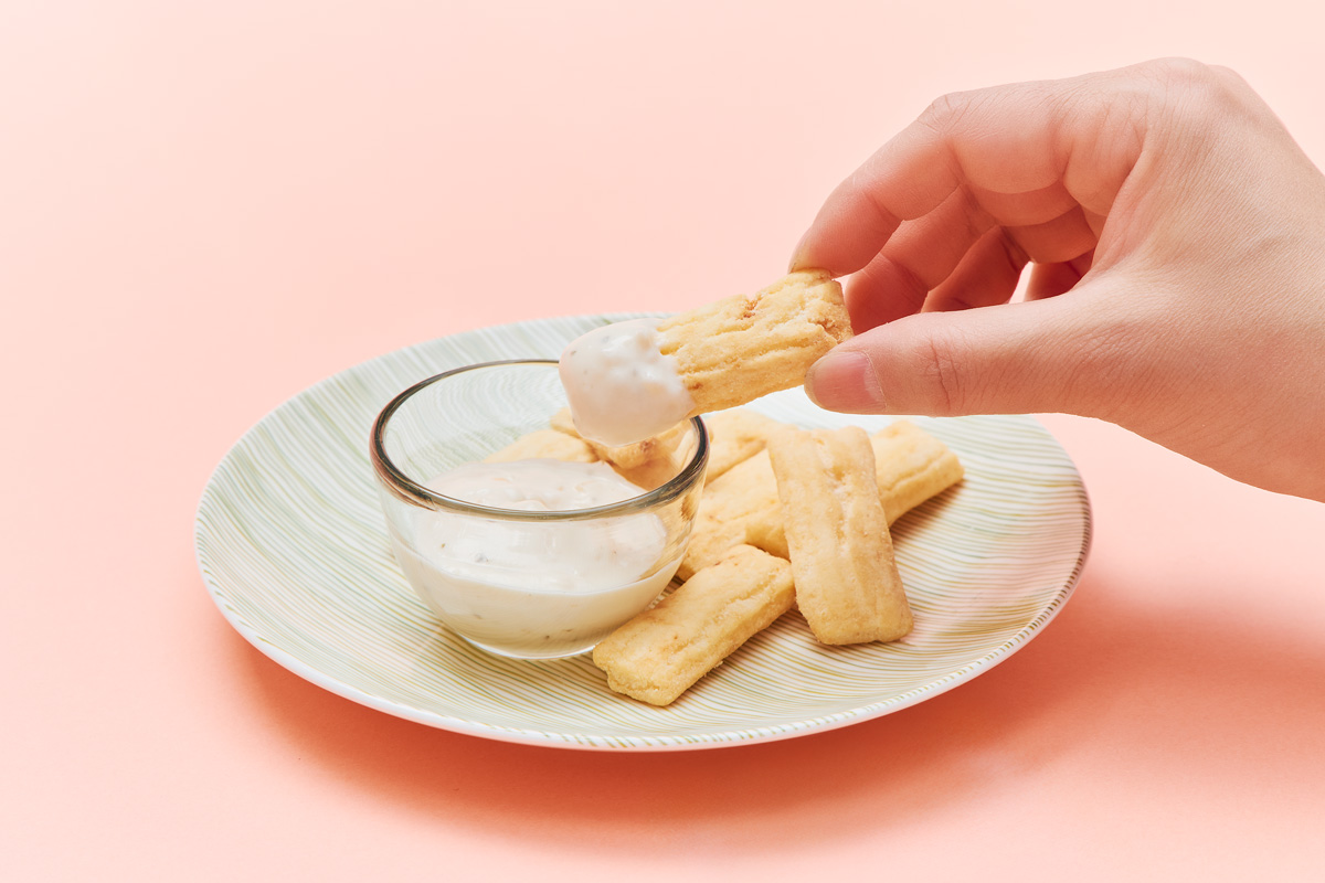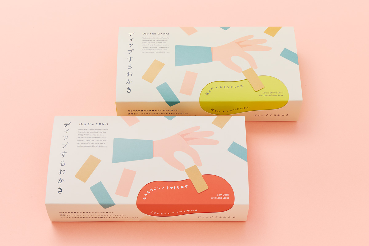 前者は、レモンの酸味と苦味をまとった桜えびが豊かに香るおかきを、レモン果汁入りでほんのり甘いタルタルにつけて。後者は、とうもろこしの甘い風味が生きたザクっとした食感のおかきと、ピリッとスパイシーなトマトソースのコンビ。ディップすることで国境を超えた広がりのある味に出合える。