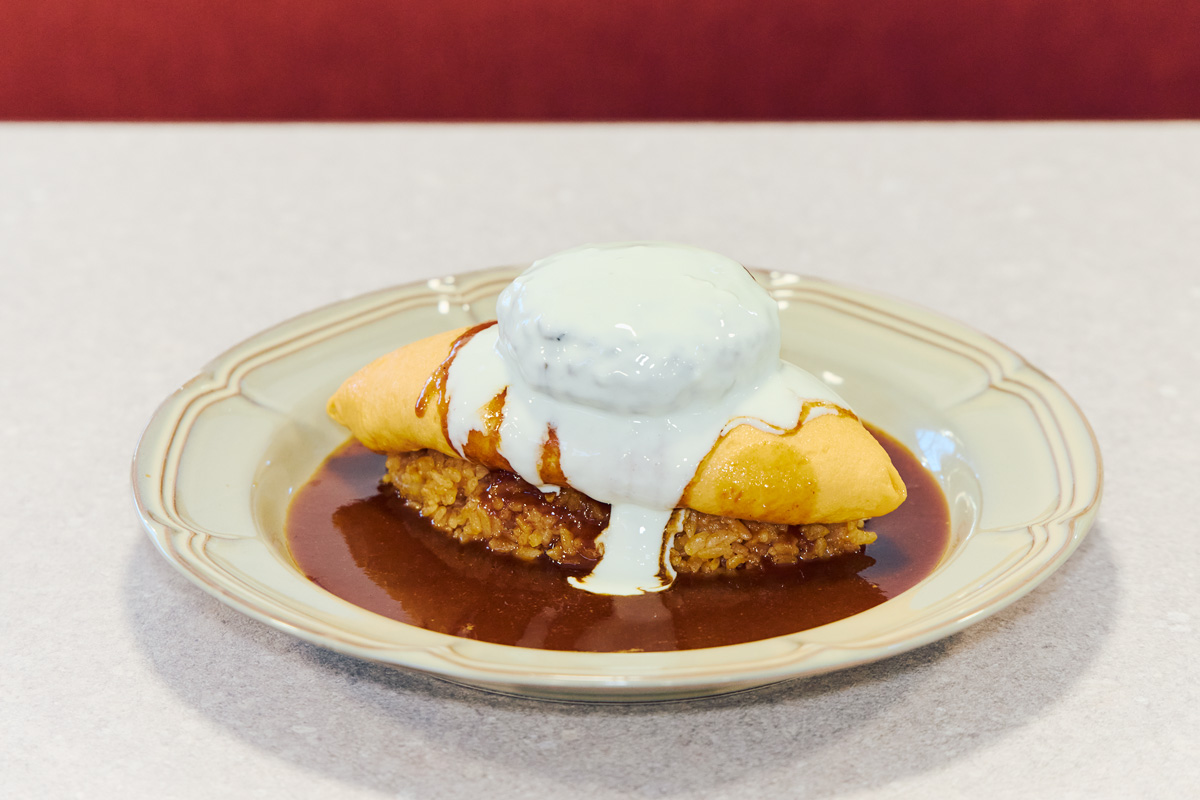 名物の「ダブルチーズハンバーグオムライス」は、中からとろりと半熟状の卵があふれだしたオムレツの上に、アツアツのハンバーグをのせ、デミグラスソースとカマンベールチーズソースをたっぷりとかけたら完成だ。