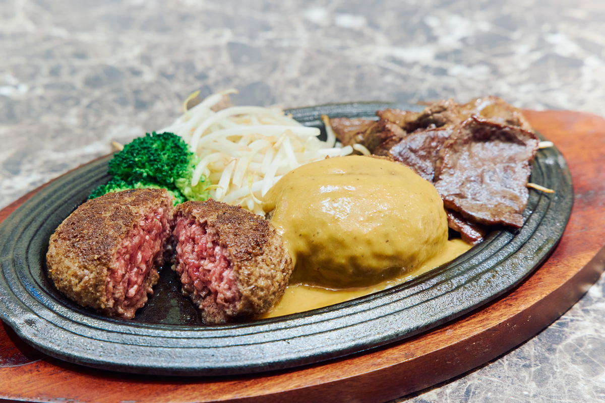 ランチタイムは、食欲をそそる音と香りとともに鉄板で運ばれてくる、黒毛和牛100%のハンバーグやステーキを。毎朝、店で肉を切り分け二度挽きして手ごねするハンバーグは、極力つなぎを加えないためステーキに近い。しっとりとしてふわっとやわらかな食感は悶絶必至! まずは塩コショウで、途中からオリジナルのオニオンソースで召し上がれ。