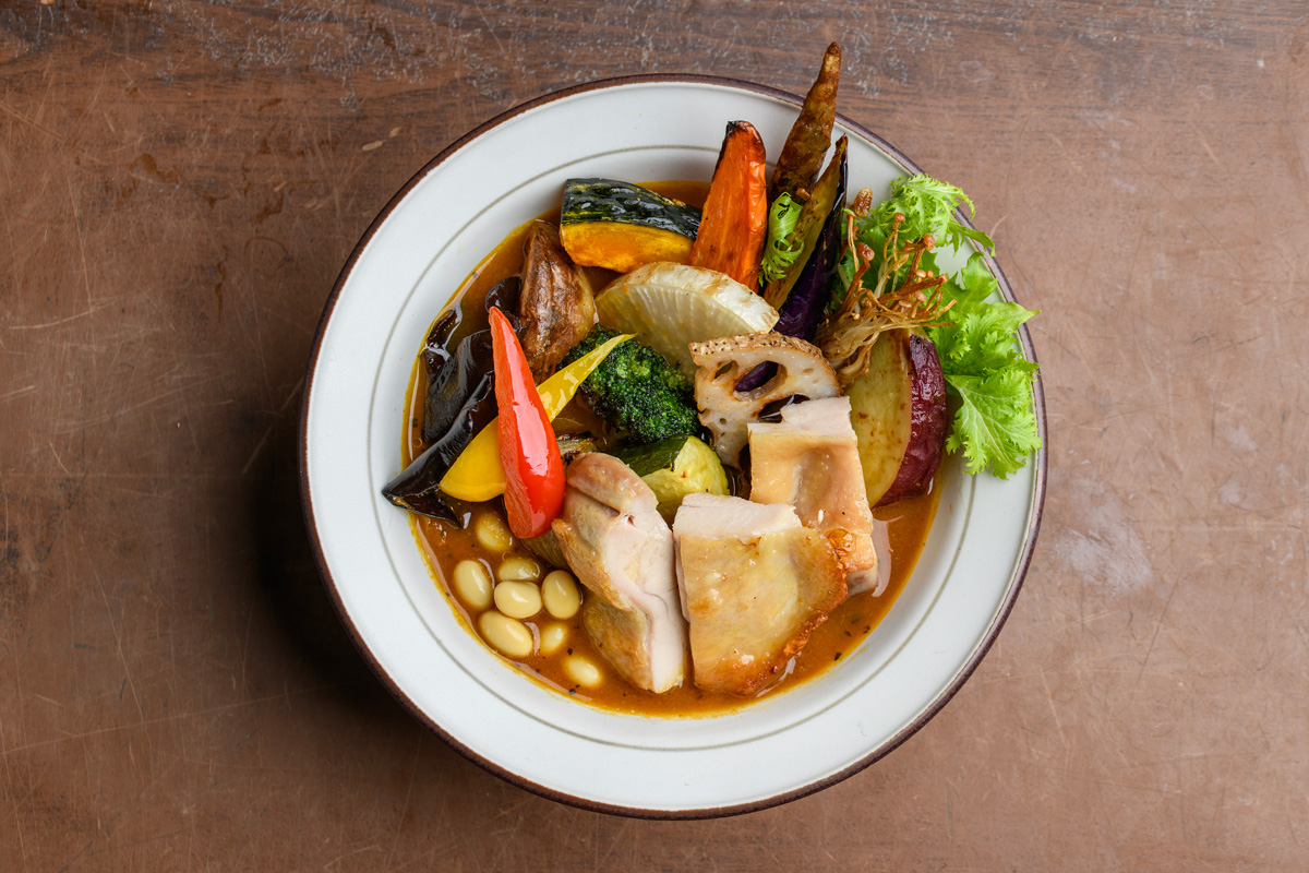 タマネギ、ニンジン、キャベツなどを煮込んだ野菜の旨みたっぷりのスープカレーに、グリルしたチキンがごろっと入った定番メニュー。季節により内容が替わる、彩り豊かな多品目の野菜は既存店とは製法を変え、こちらでは揚げずに蒸し焼きに。それぞれの野菜の味わいを引き出す工夫がなされている。