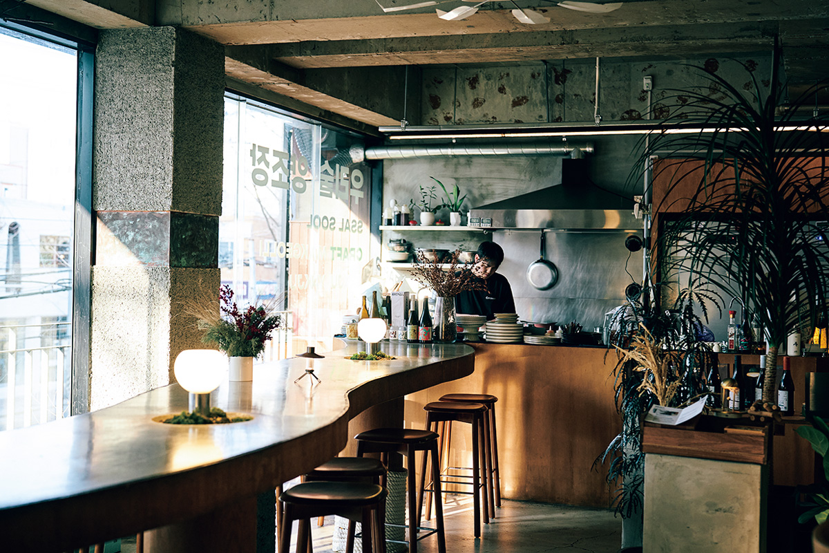 オーナー、イ・ジピョンさんが率いる、新たな材料でマッコリの開発を続ける店。店内に韓国伝統酒の醸造所を有し、出来たてのマッコリやタクチュ(酒を濾過する工程で清酒と分ける前の白く濁った液体)をタップで提供する。スペアミント、ゆずを使い、炭酸味のはっきりした看板マッコリ「欲望の荒波」は、ユニークなネーミングも楽しい。米本来の甘味と果物やハーブの新鮮な香りを感じられるクラフトマッコリのおいしさをじっくり味ってみてほしい。