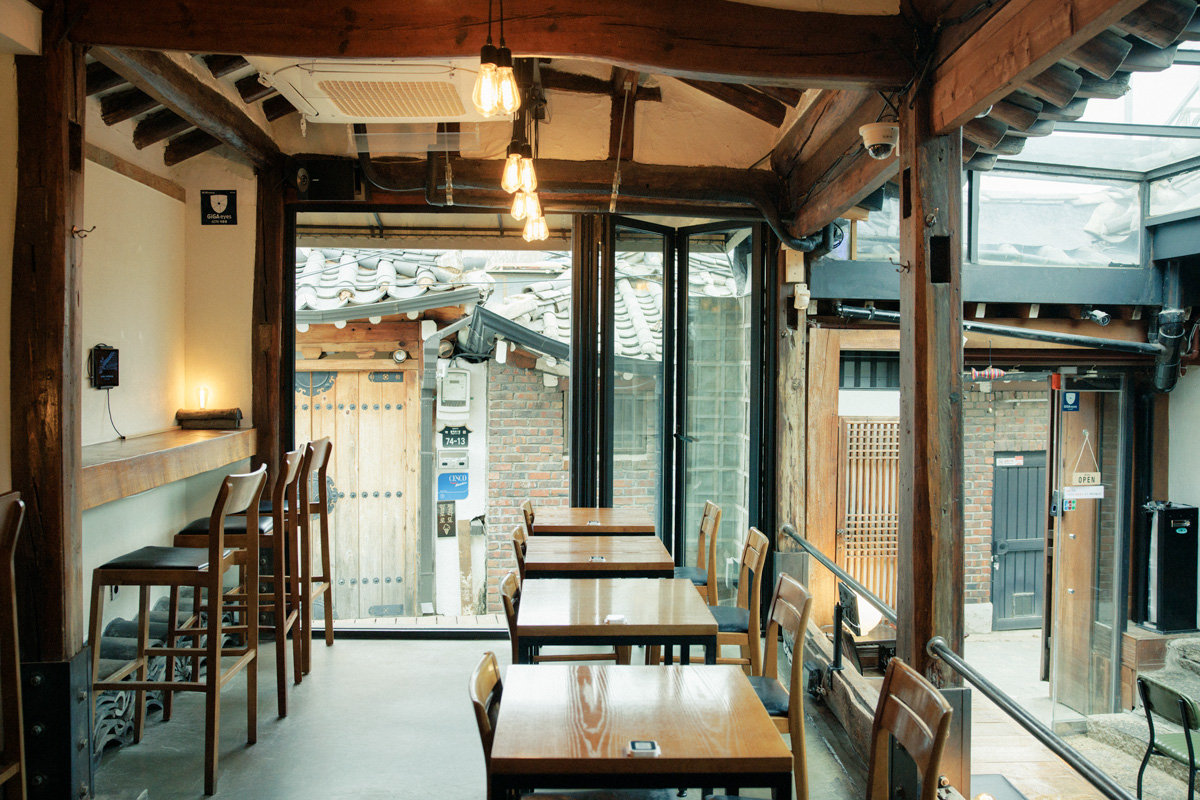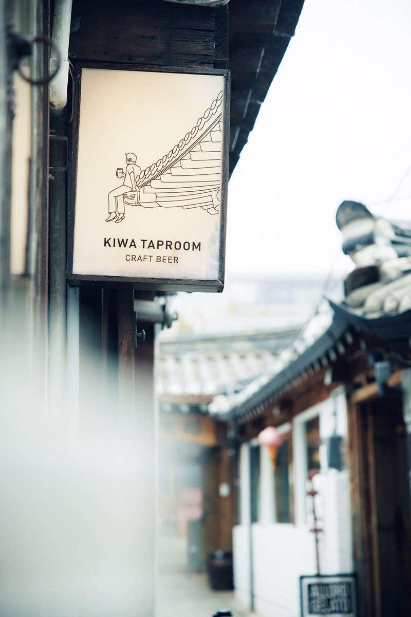 住居兼服飾工房だった韓屋が、カジュアルに利用できるタップルームとして再生。中庭を備えた韓国古来の間取りを活かし、サンルームのように光を取り込む設計に。小上がりにも座椅子を置くなど段差も巧みに活用し、空間のあちこちにゲストの居場所を作っている。用意するのは、自社醸造の〈EULJIRO BREWING(ウルチロ ブルーイング)〉のクラフトビールをはじめ、常時6種ほど。セリとエビのチヂミ21,000ウォンなどフードは、ボリュームがあるのでおつまみにも、食事にも。路地裏に隠れた最高のチルスポットで、昼から一杯。