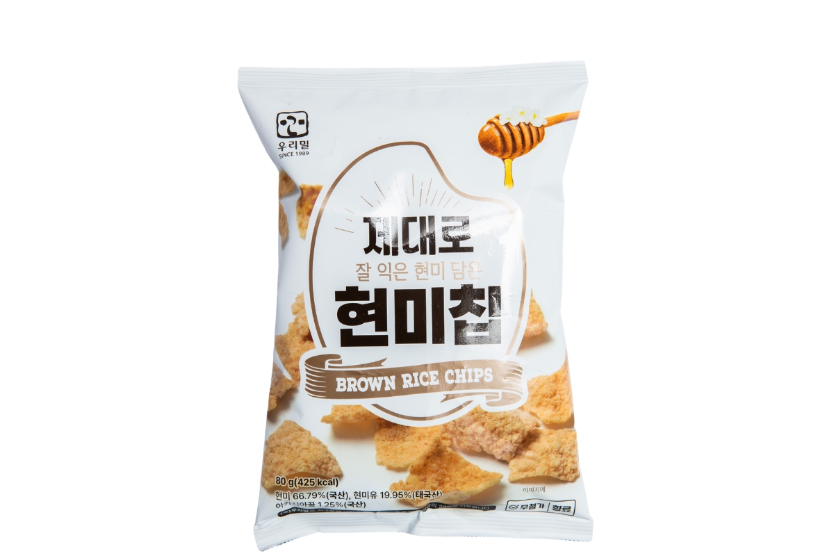 韓国産小麦ブランド「ウリミル」の玄米チップス。国産アカシアハニーと天日塩を使用し、サクサクのあと優しい甘みが広がる。2,300ウォン(80g)。