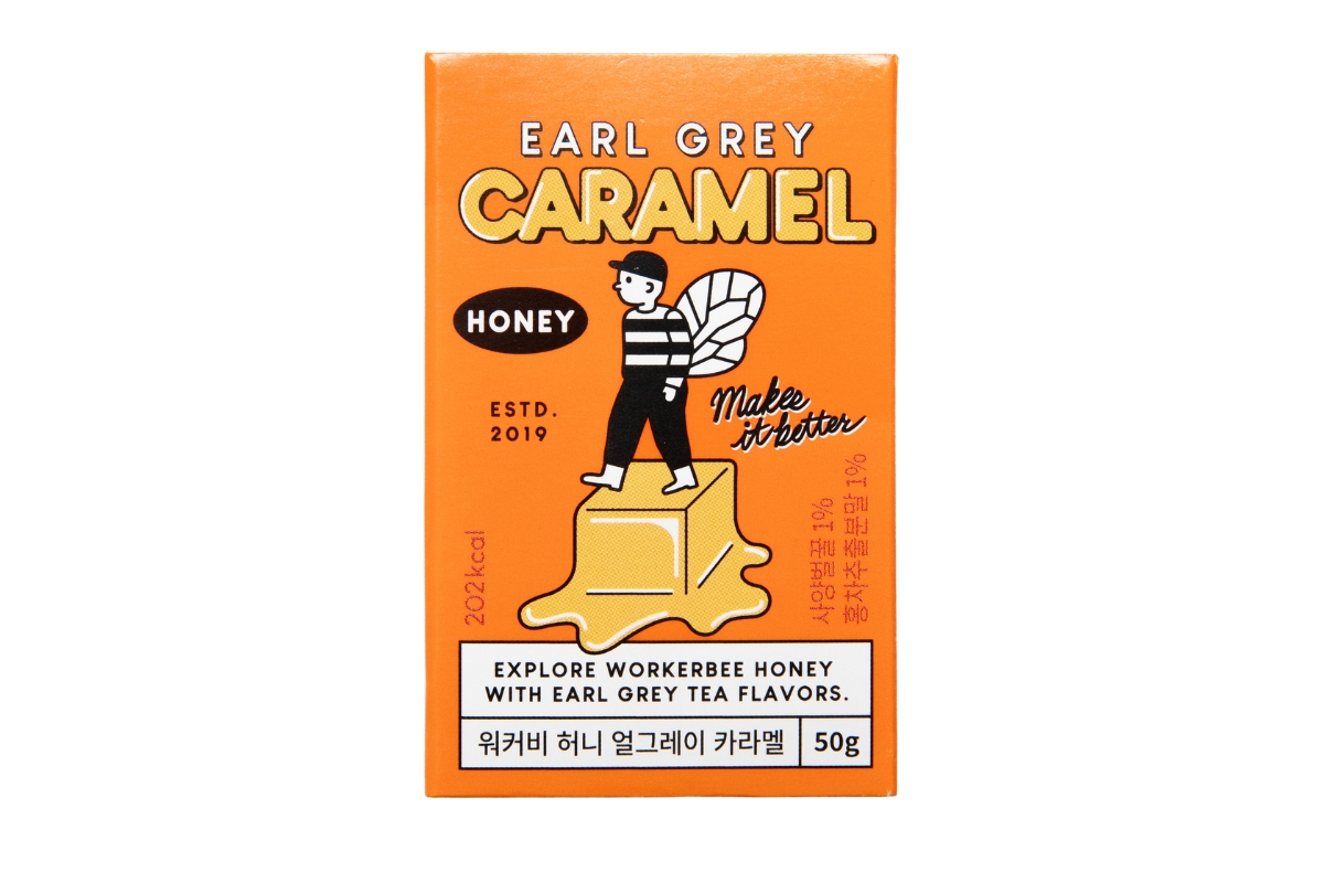 はちみつの濃厚な風味を閉じ込めた、ねっとり食感のキャラメル。アールグレイティーのような香りを楽しめる。3,200ウォン(12個入り)。