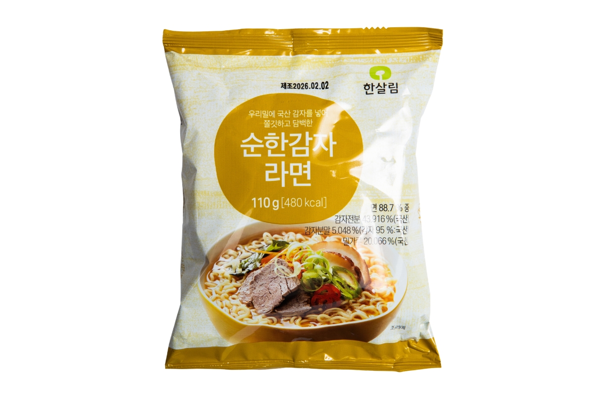 国産ジャガイモを練り込んだもちもち食感のインスタントラーメン。化学調味料を使わず、辛さは控えめ。スパイシー味もあり。2,090ウォン。