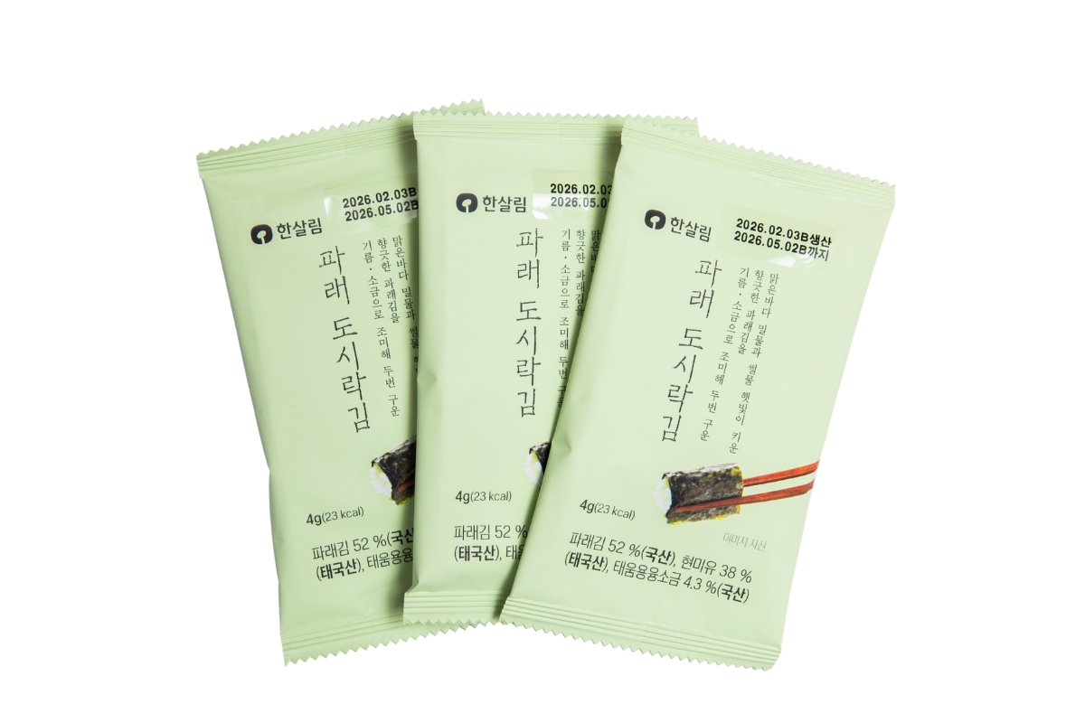 人気の韓国のりシリーズの弁当サイズ。こちらはパレ(青のり)入りで、豊かな香りの油、塩で味付けし二度焼きしている。5,170ウォン(4g×9袋)。