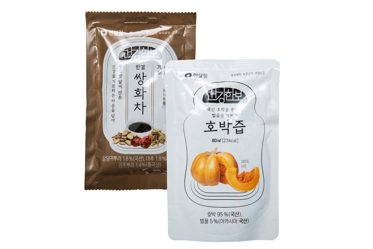 むくみに効果があるかぼちゃ汁790ウォン(80ml)などの野菜汁や、伝統的な薬膳茶・サンファ茶W=2,860(70㎖)といったパウチジュースも豊富。