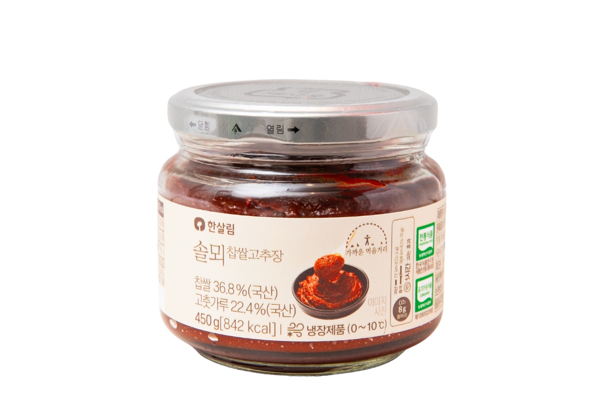オリジナル調味料も人気。チュンチョンナムド忠清南道・ソルメ産のもち米と唐辛子粉を使ったコチュジャン。ビビンバやチゲなどいろんな料理に重宝。18,040ウォン(450g)。