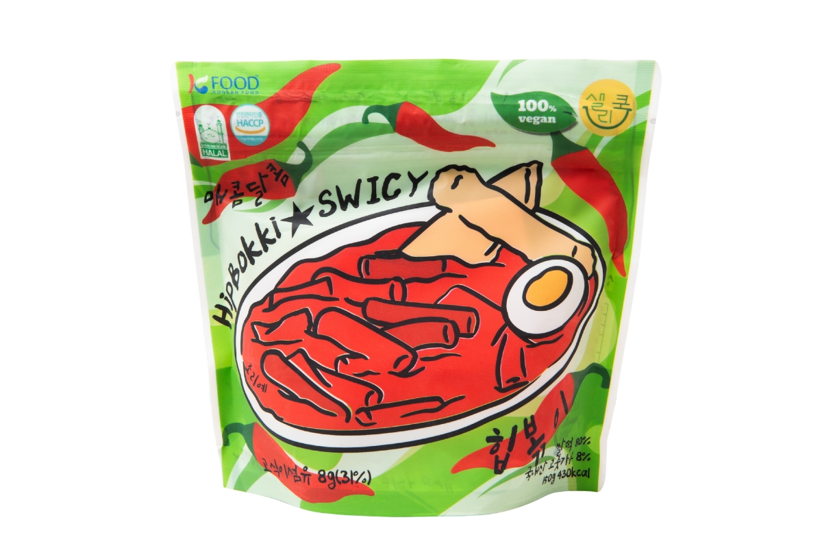 100%ビーガンのインスタントトッポギ。パウチを開けて餅とソース、水を入れてレンジでチンするだけ。5,200ウォン(150g)。