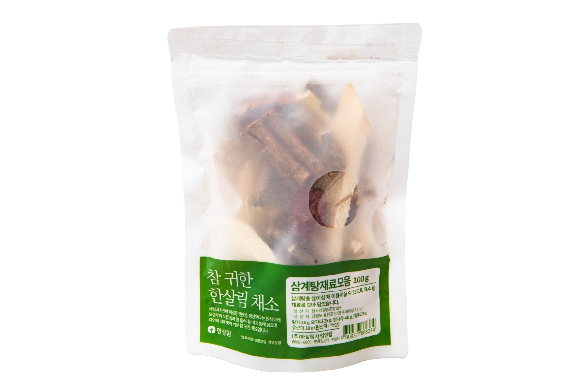 ファンギ(黄耆)やオガピ(五加皮)、オムナム、ナツメ、湯根皮など、参鶏湯を煮込むときに必要な漢方食材を揃えたパック。5,000ウォン。