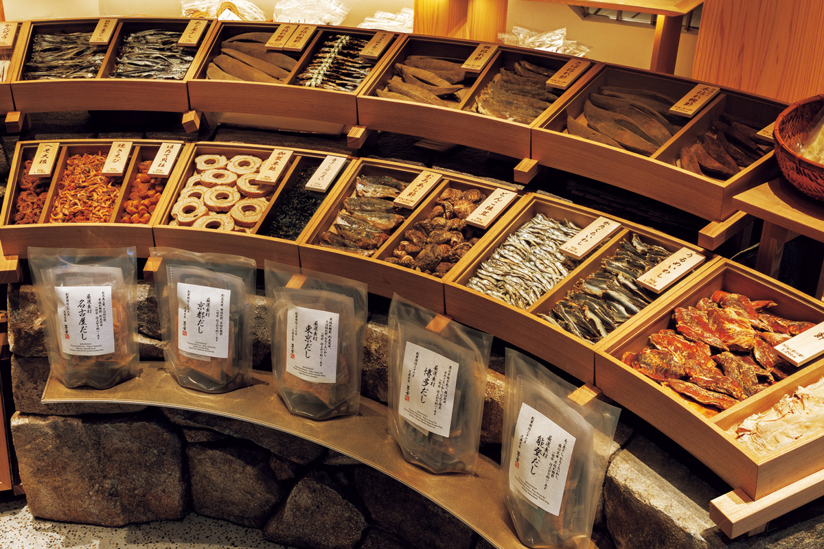 焼きあご、昆布、鰹節にどんこ。日本の上質な乾物が、「茅乃舎」のだしを支えている。市場の乾物屋のような木箱のディスプレイは、隈研吾の発案。実物を見ることでだし文化への理解も深まる。