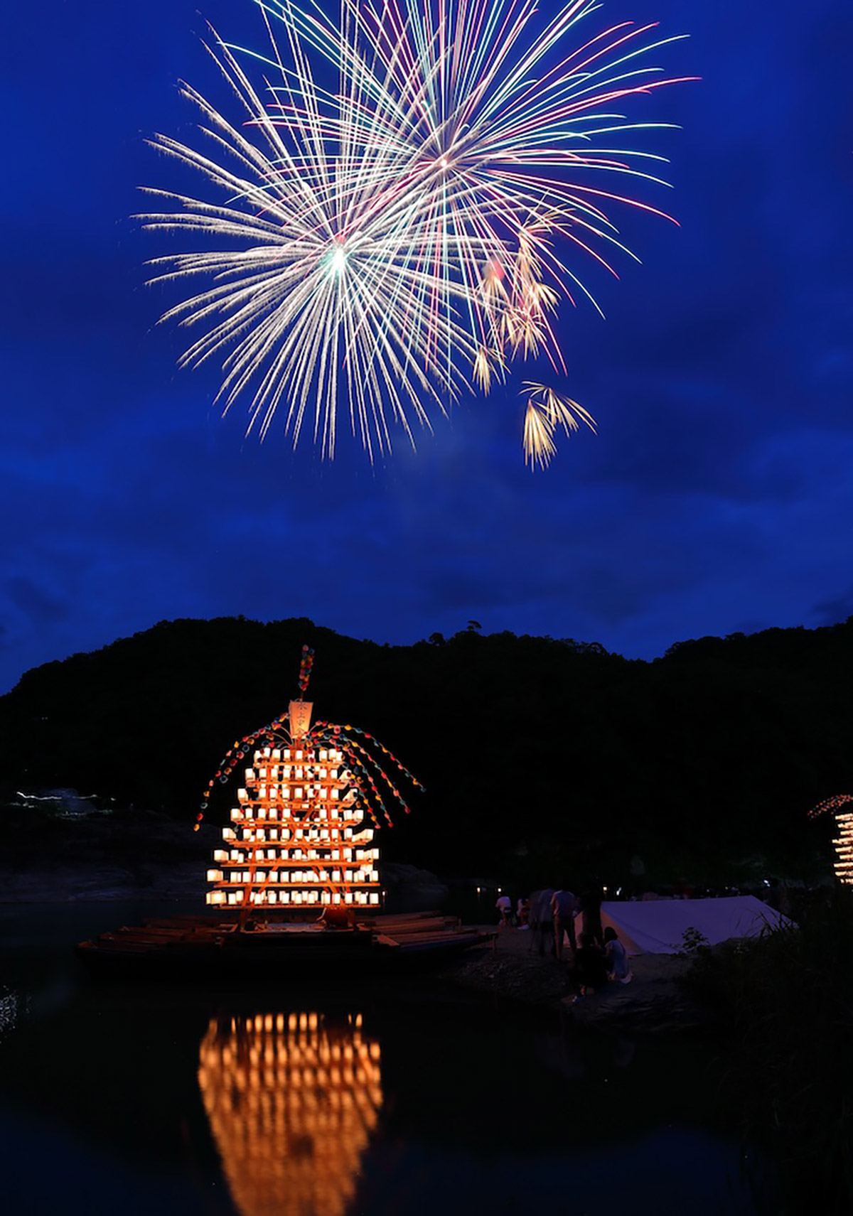 日暮れとともに宵闇が迫ると灯ろうが荒川に浮かべられ、万灯船の雪洞とともに水面を照らして、あたり一面に幻想的な雰囲気に包まれます。灯りに見入るうちに心がふっと静かになり、人智を超えた何かに祈るような気持ちに。 この後、対岸から花火が上がり、夜空に色鮮やかな花を咲かせます。万灯船とともに見上げる花火は一服の絵のようで、思わずうっとり。
