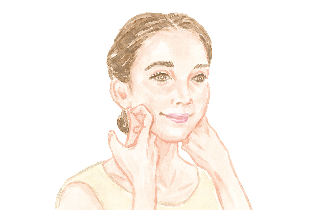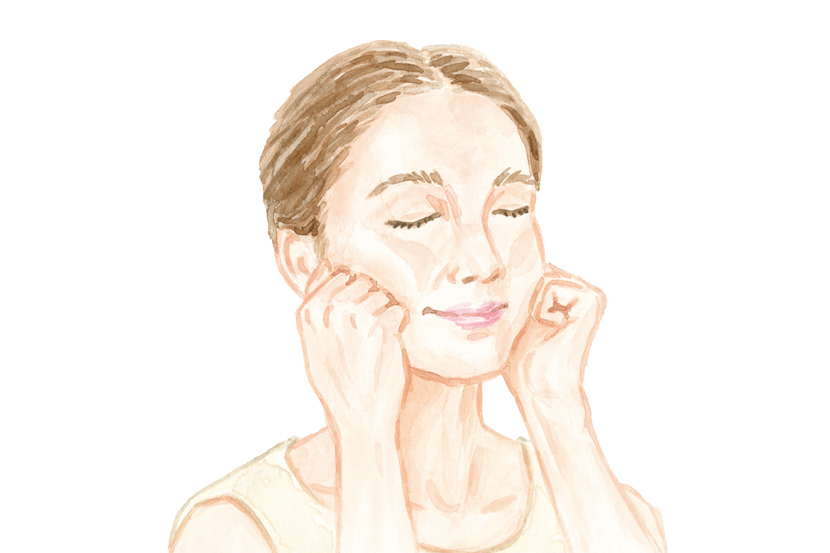 口角からこめかみに向かって、指の腹でグッと皮膚を引き上げる。位置を記憶させるような気持ちで、10〜15秒キープ。クリームなどを塗る延長で行うと、肌への摩擦負担も軽減。