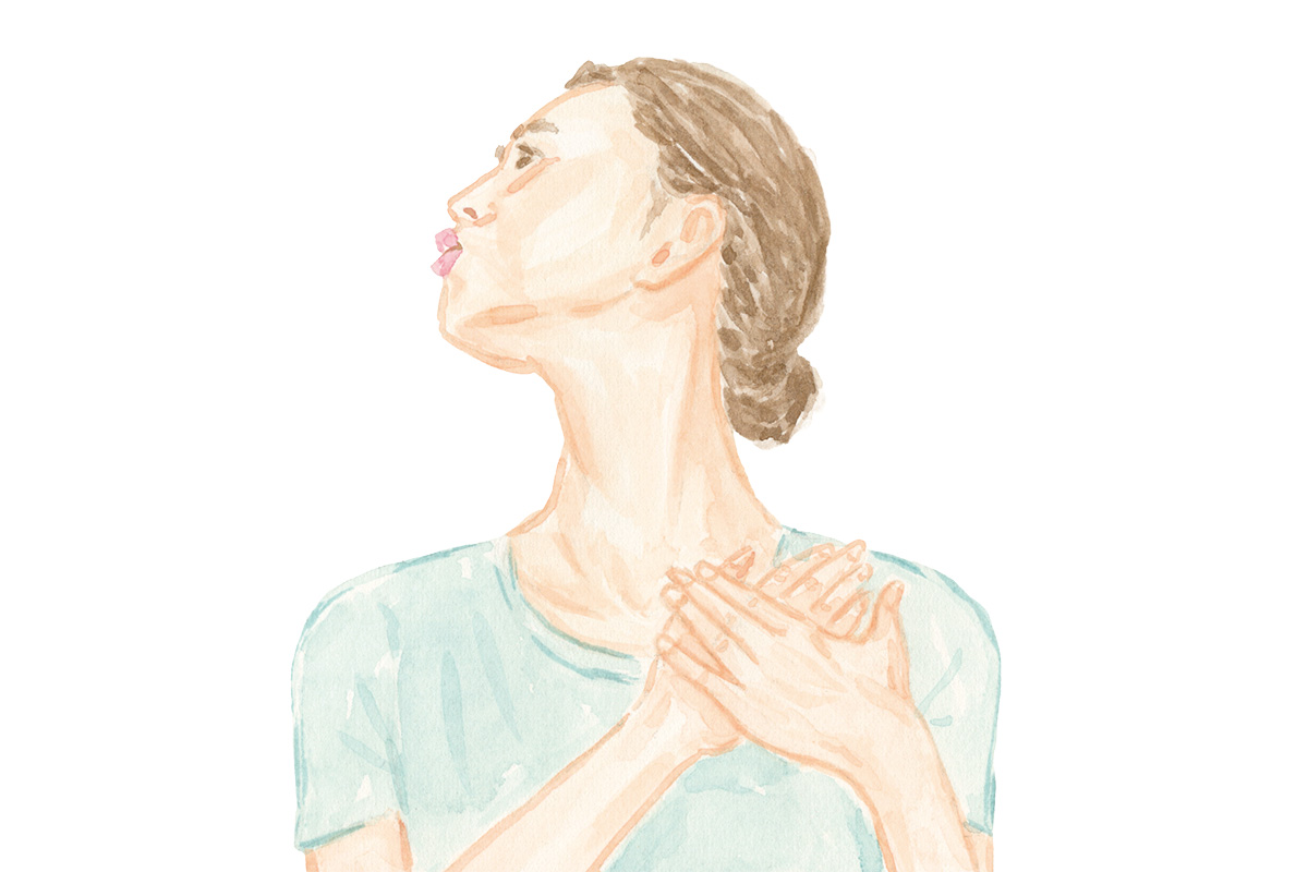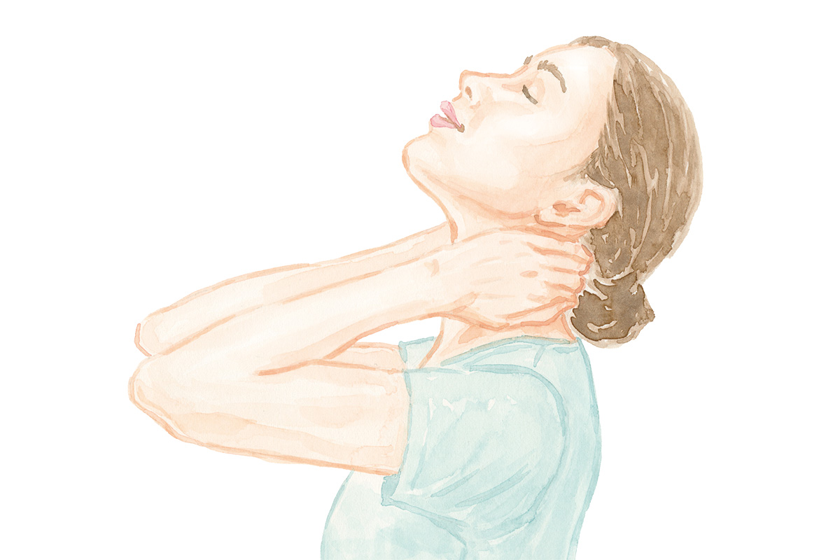 さらに、もたつき改善の効果を高めたいなら、上を向くときに上あごを舌で押し上げながら鼻から息を吸い込み、さらなる負荷をかけて。ストレートネック予防にも効果的。