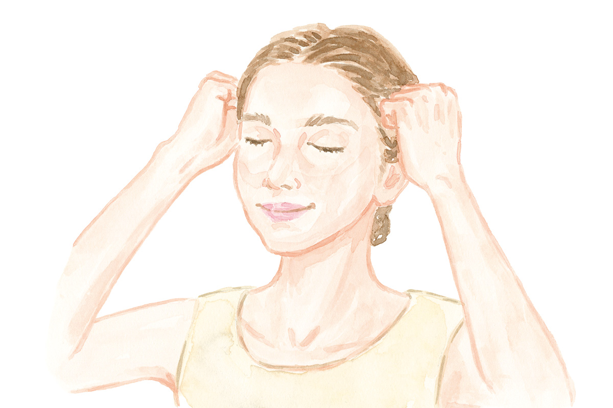 こぶしの第二関節を使い、側頭筋を30秒程度ほぐす。側頭筋は強めに刺激をしてOK。そのまま上へと引き上げて15秒程度キープ。シャンプーの延長でマッサージするのもおすすめ。