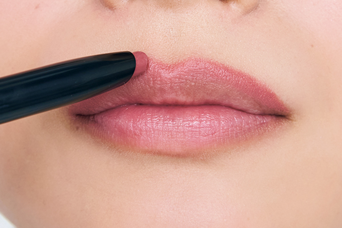 「大人の唇はボリュームも削がれ、血色もなくなり、ついつい赤やローズ系ばかり手に取りがちですが、ベースにリップライナーを仕込めば、どんなリップも映える唇に。上唇のみ2ミリオーバーにラインを引いて」