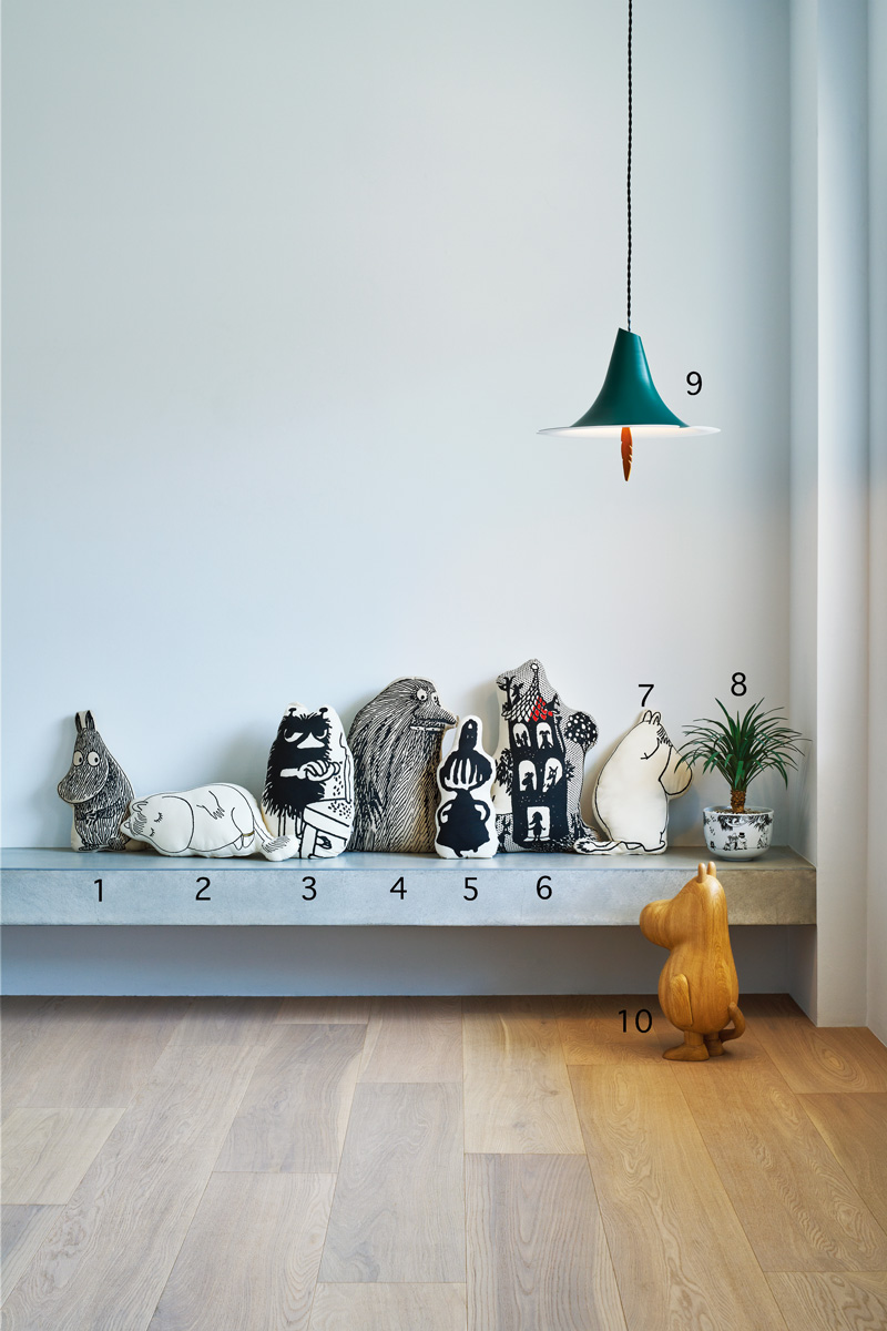 色も線画のタッチもシックな「MOOMIN×a part of me.」のクッションは、左から、1. 「暗闇ムーミン」8,250円、2. 「スノークのおじょうさん」8,250円、3. 「スティンキー」8,800円、4. 「モラン」13,200円、5. 「リトルミイ」7,700円、6. 「ムーミンハウス」16,500円、7. 「目隠しムーミン」7,700円。高さ38~55㎝(全てア・パート オブ ミー―ワイズフォーリビング 03-6712-8612)/8. 植物を植えた陶器の「ムーミンボウル」はフィンランドの〈プラントゥイ〉製。11,000円(ヴェクスセットジャパン 048-487-7355)/9. スチール製の照明は「スナフキンの忘れもの」。木製プルスイッチは羽根飾りの形。30,800円(ディ クラッセ 03-3876-6610)/10. 天然オーク材で手作りしたオブジェはデンマークの〈BOYHOOD〉製。「BOYHOOD MOOMINTROLL」XL 高さ45㎝ 726,000円(ネイビーズ 03-5654-5803)愛らしいキャラクターたちのクッションを並べ、眺めても座っても楽しいアートなコーナーを。モノトーンを中心にすると大人っぽい雰囲気になる。