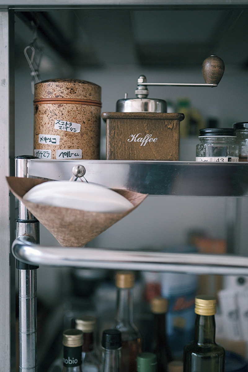 調味料用ワゴンの前面に愛用のコーヒーツールを。樺細工の豆入れは10年来の愛用品で、恵比寿〈ヴェルデ〉で豆を購入時、袋に貼られるシールを移植。