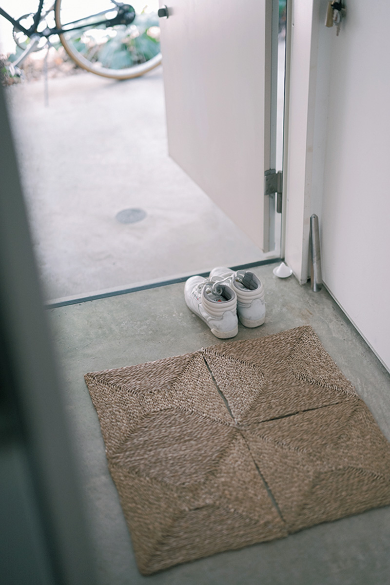 一般的な玄関はなく室内すべてフラットな床なので、ドアの前にマットを置いて結界に。汚れを入れない、とどめない習慣ができて一石二鳥。