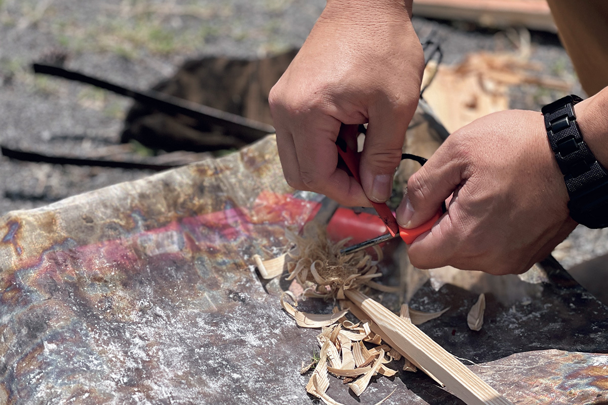 自分で作った自然の着火剤「フェザースティック」で火おこしチャレンジ。
