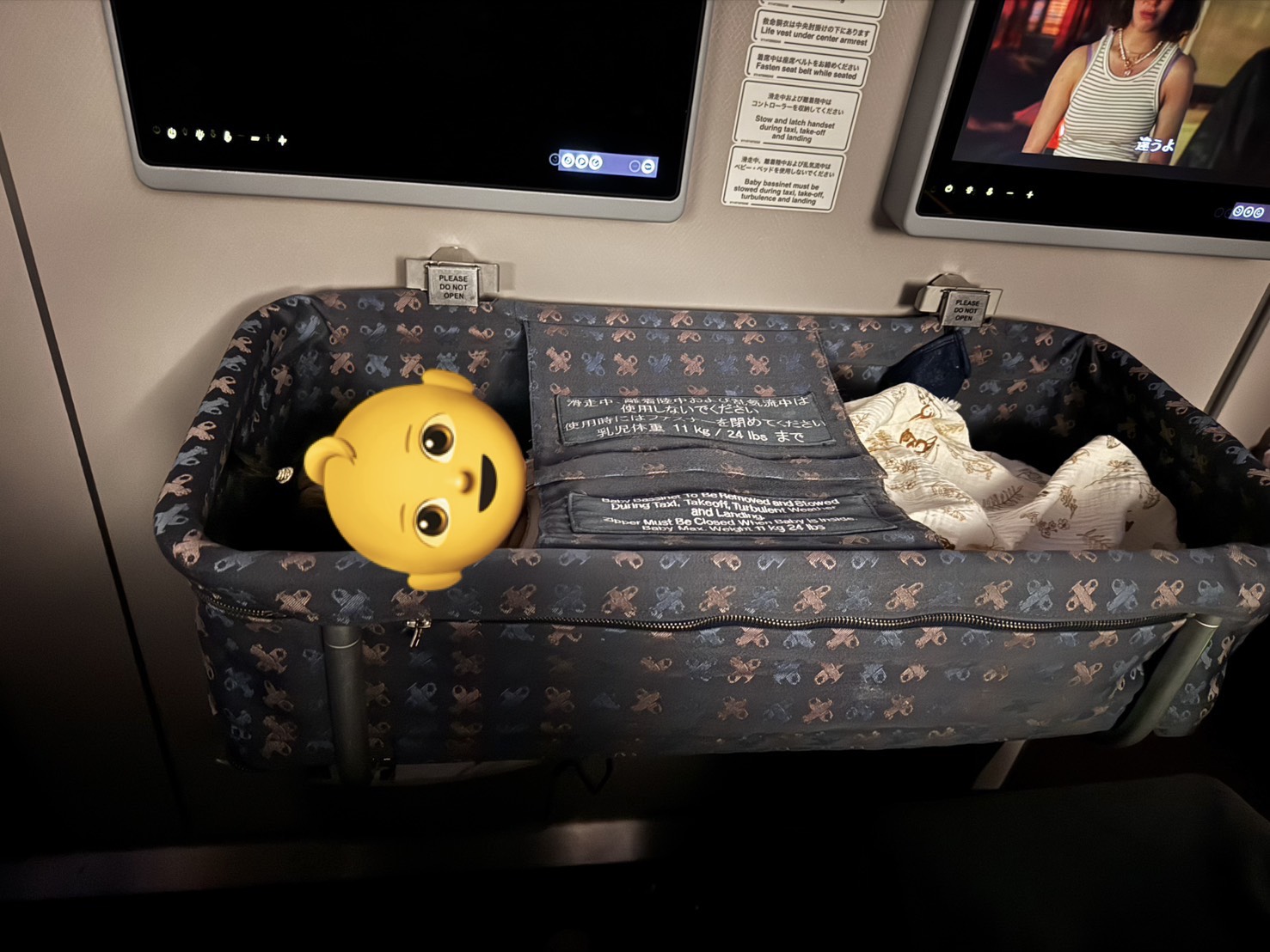 あと、バシネットは硬いことで有名らしくて、飛行機が気流で揺れたりするとその振動がダイレクトに赤ちゃんに伝わって泣きだしたりすることが多いので、下に敷く用のモフモフの毛布とかを持っていくのがおすすめです。