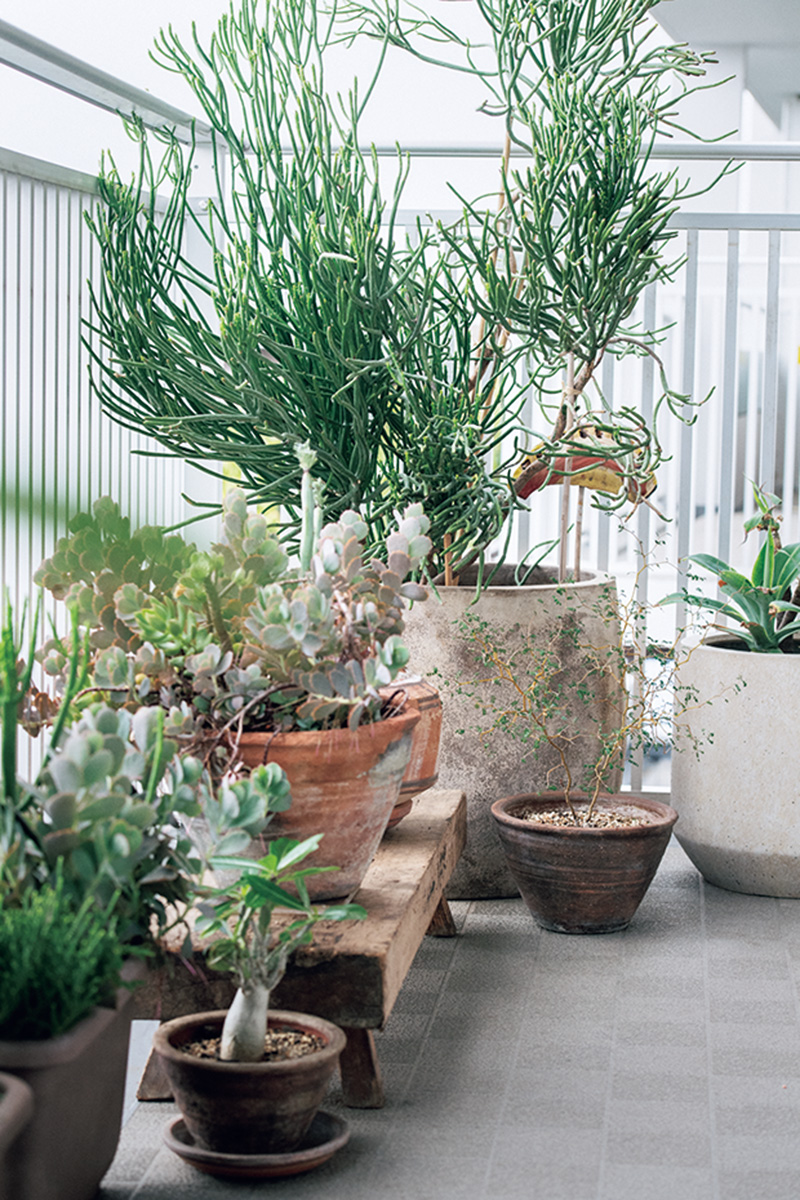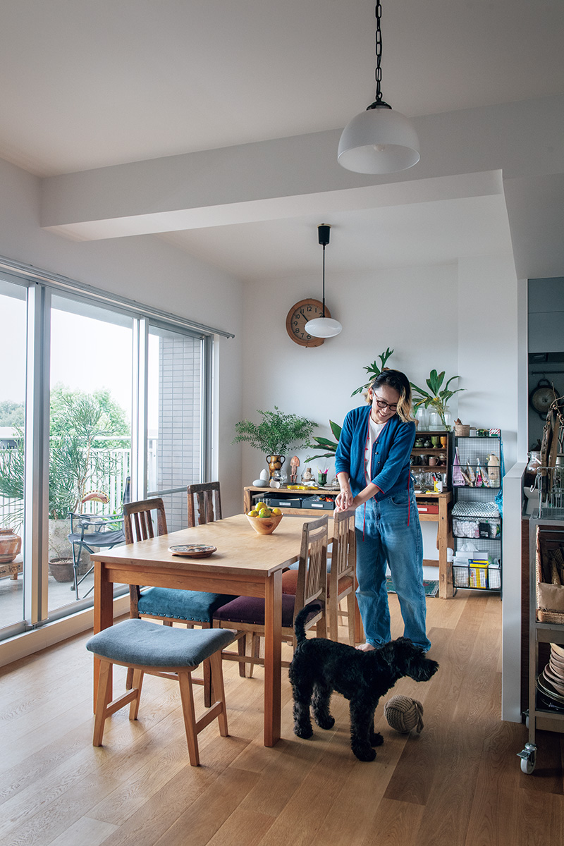 郊外型の生活には車が必須と、ペーパードライバーを脱するべく、運転の練習も始めたという。世田谷にある店への通勤はやや時間がかかるようになったが、それ以外は「緑豊かで広々とした公園があったり、直売所で朝採れの野菜を買えたりすることがうれしい。あと、植物も驚くほど安く買えて」と、満足度は上々のよう。室内を大小の観葉植物が彩り、ベランダのプランターでハーブも育てている。
