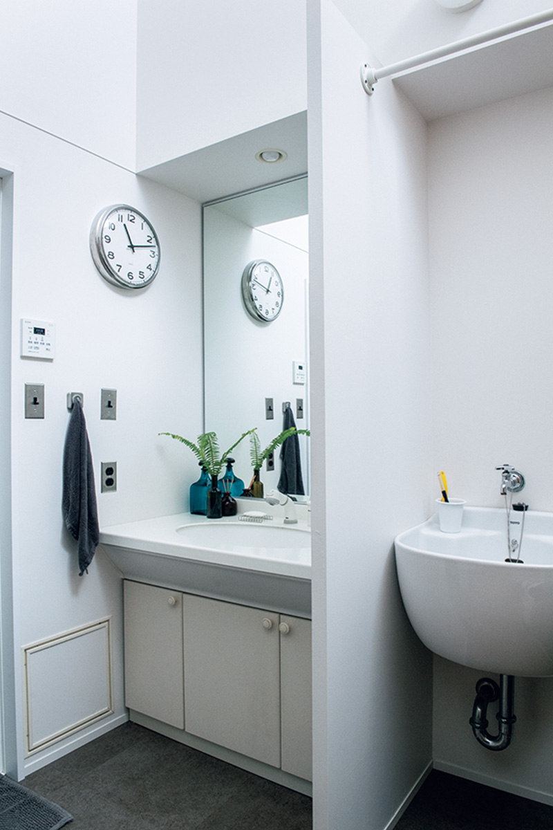 集合住宅では珍しく洗面所にも自然光がたっぷり射し込み、洗面台に加え、掃除・洗濯に便利なシンクも。新居で密かに気に入っている場所だ。