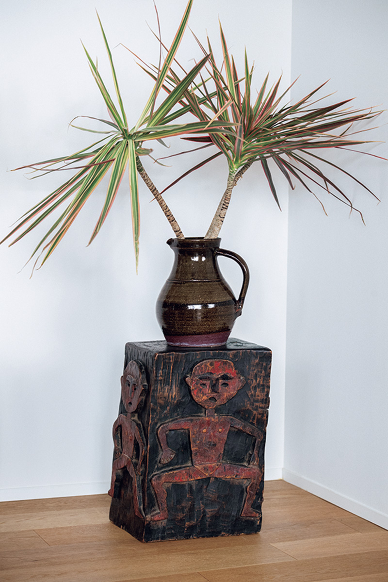 家具に関しては「世界の民芸品、経年の味があるものが好き」と石原さん。写真は台湾先住民族のスツール。花器は〈倉敷堤窯〉武内真木さんの作品。