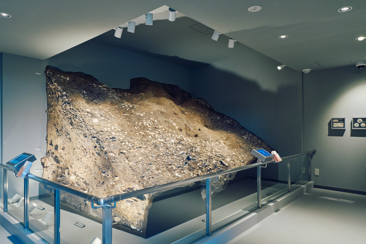 公園の北端にある〈貝塚観察館〉までは、フィールドワークしながらゆっくり歩いても20分ほどで到着する。目の前に広がるのは最低限の解説などが設けられた“何もない原っぱ”。不思議とそれが「ここを縄文人が歩いたのかも……」などと好奇心をかきたてる。そうしてたどり着いた観察館では、実際の貝塚からはぎとった地層を豪快に立体展示。縄文がグッと近くなること請け合いだ。