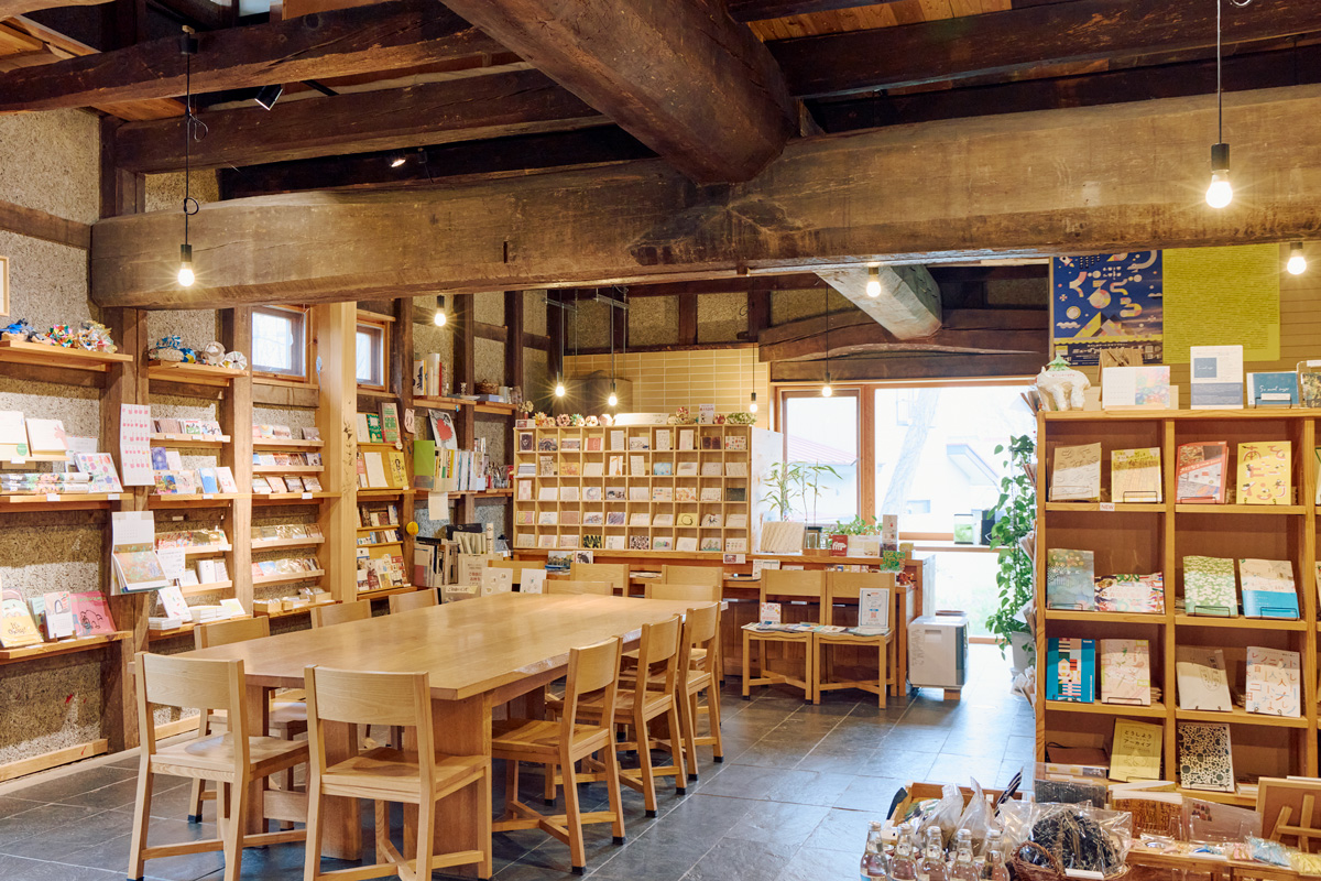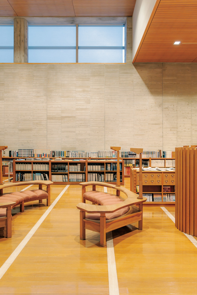 「須賀川市はウルトラマンを生んだ円谷英二監督の故郷。5階の〈円谷英二ミュージアム〉に来た人が、そのまま3、4階の図書館に立ち寄ったり、1階のカフェでひと息ついたり。目的を超えた楽しみと出合えるんです」とスタッフの横田光洋さんは言う。1階には大通りのような吹き抜け通路。坂道が多い須賀川の街とつながるように、床がゆるりと傾斜している。館内のあちこちに書架があり、読書コーナーや縁側みたいなテラスなど、ちょっと座りたくなる居場所もたくさん。市民も観光客も制服姿の学生も、垣根なく過ごせるのがうれしい。