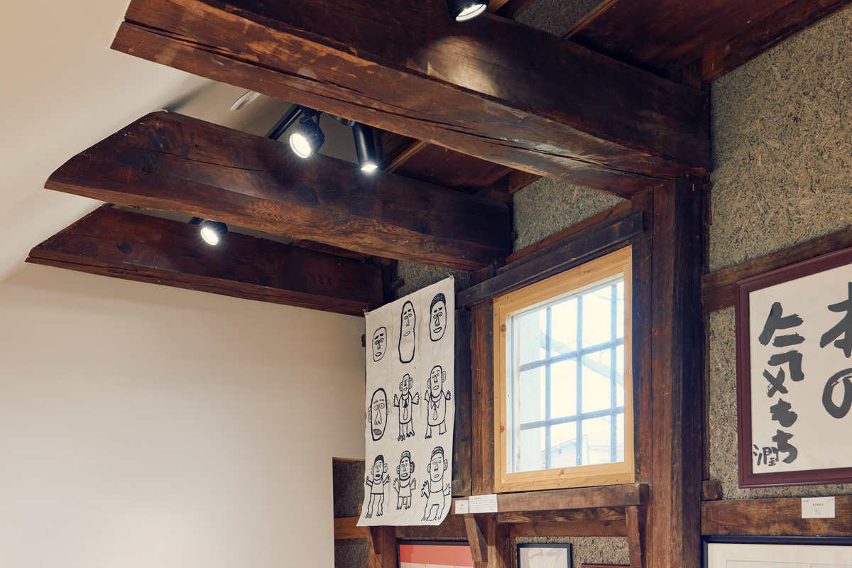 長さ十八間(約33m)もの大梁を持つ、通称「十八間蔵」。東日本大震災で半壊したその建物を、アール・ブリュットや現代美術を展示する美術館へと再生した。設計は、素材使いと光の操作に定評のある建築家・竹原義二。館内の3分の1は誰もが自由に出入りできる土間の多目的スペース、残りが靴を脱いであがる展示空間だ。