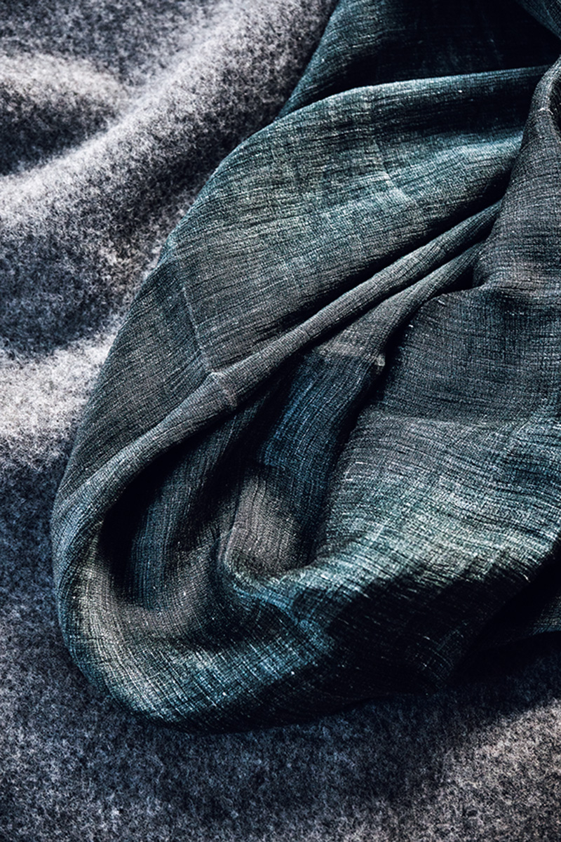 下・残糸を活用する〈loomer〉のシェットランドウール100%のブランケット。老舗機屋の三代目が立ち上げた〈Watanabe Textile〉の布はカーテン等に。