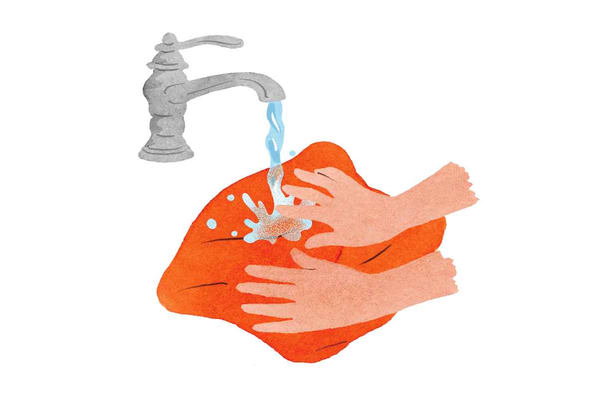 デリケートな衣類ほど、水に触れる時間を短くするのがポイント。脱水を挟むことで汚れと洗剤を一気に飛ばし、水に浸かる工程=すすぎを減らせる。洗濯ネットに入れた後は余った部分を縛り、摩擦を防ぐようにすると傷みにくい。
