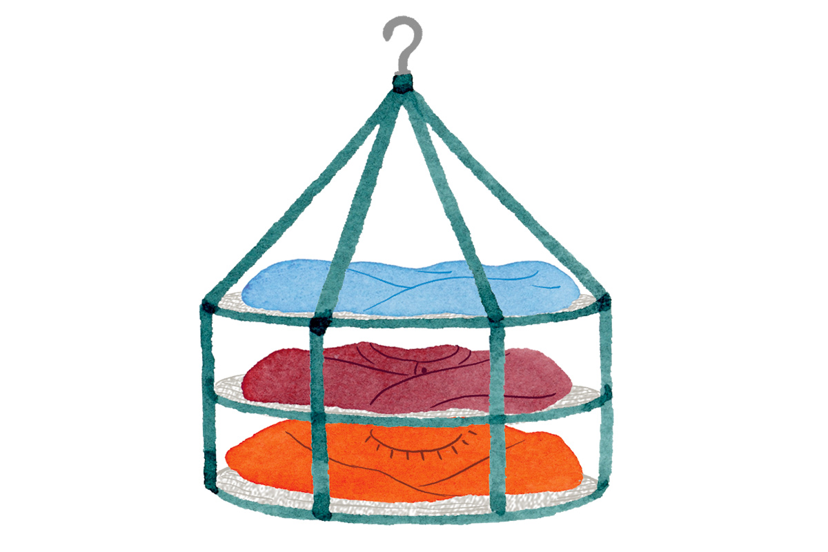 水分で袖や肩幅部分が伸びて型崩れするのを防ぐため、重さを分散させて干すこと。平干しネットが無い場合は、肩幅の広いハンガーにニットをかけ、身頃と袖はもう1本のハンガーにのせる「おばけ干し」がおすすめ。
