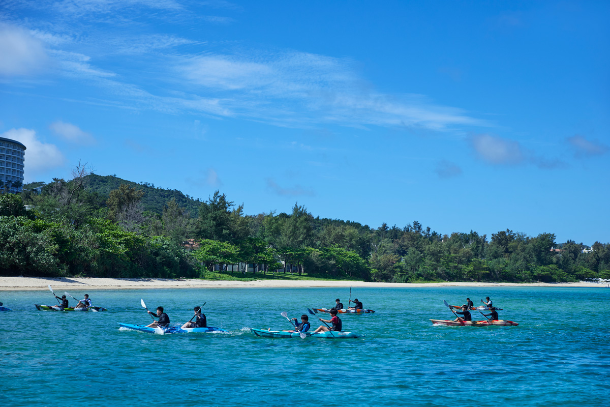 〈オリエンタルホテル 沖縄リゾート&スパ〉はマリンアクティビティも大充実。ホテルの目の前にあるかりゆしビーチでは、ドラゴンボートやグラスボート、巨大なウォーターランドが楽しめる、アクアアドベンチャーパスがお得。少し足をのばせば、天然記念物の大浦マングローブ林で、まるでジャングルクルーズのようにカヤックでゆったりと周遊も。珍しい植物や生き物に出合える冒険カヤック、夜空を眺めながらのナイトカヤックは、原始の海を進むかのようで深く心に残るはず。