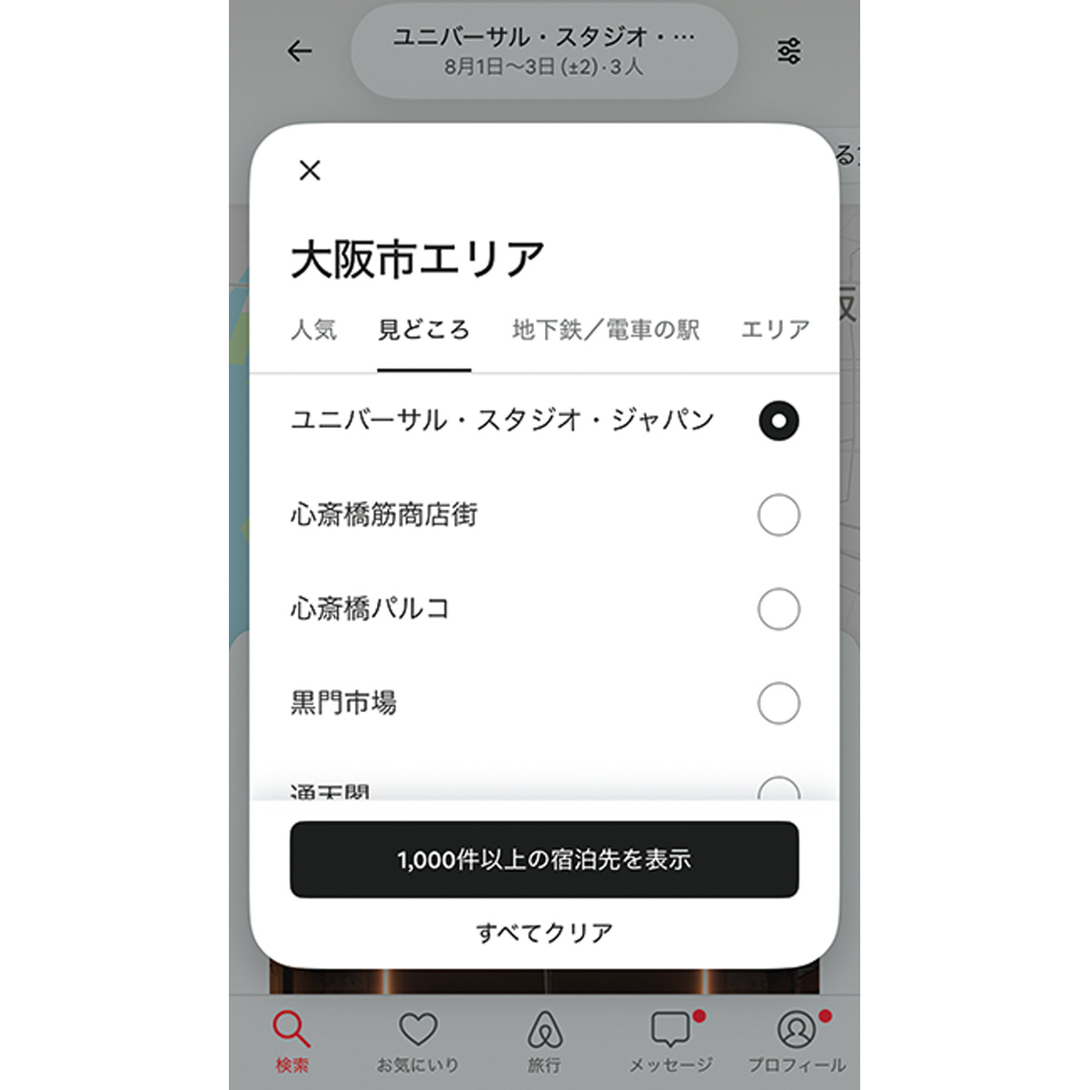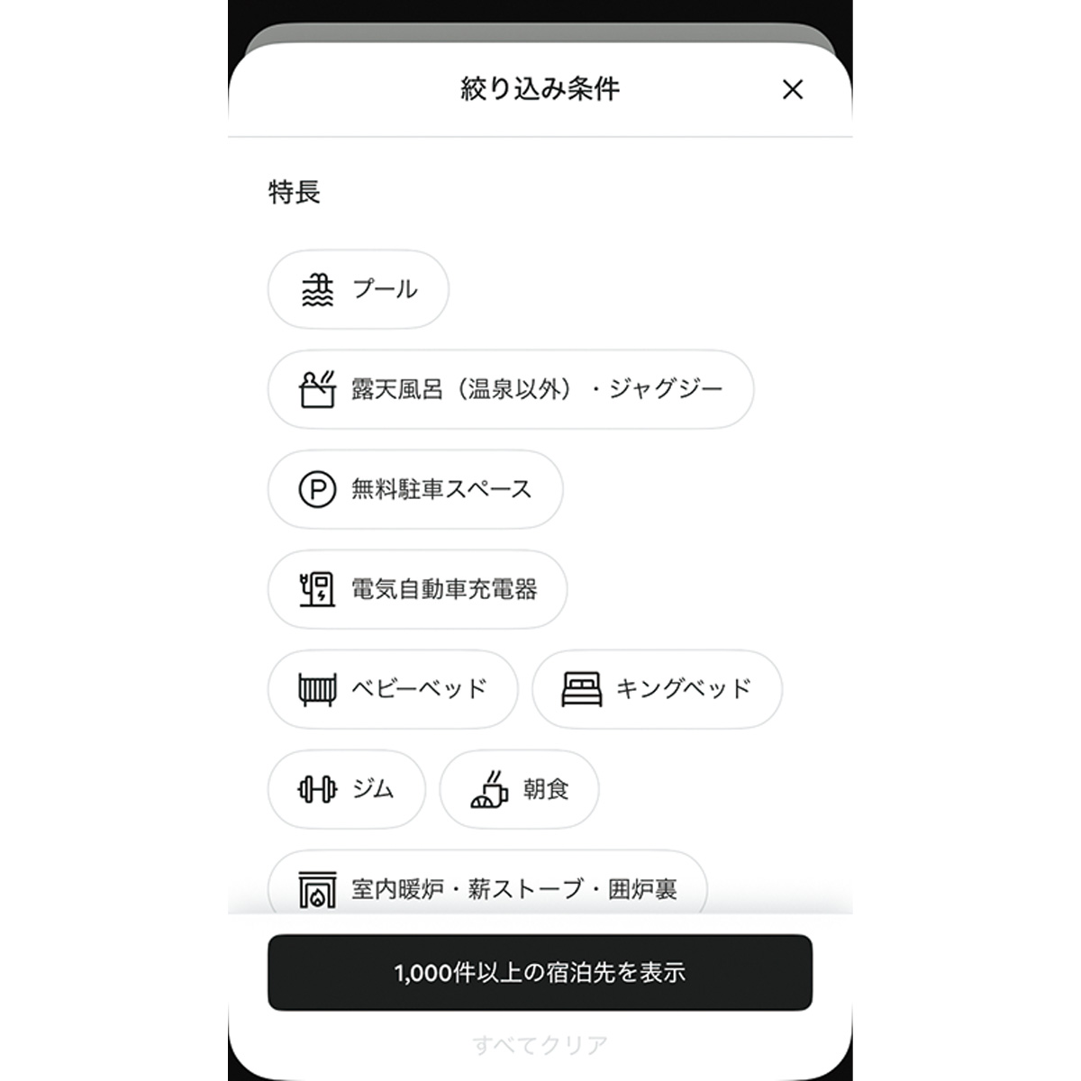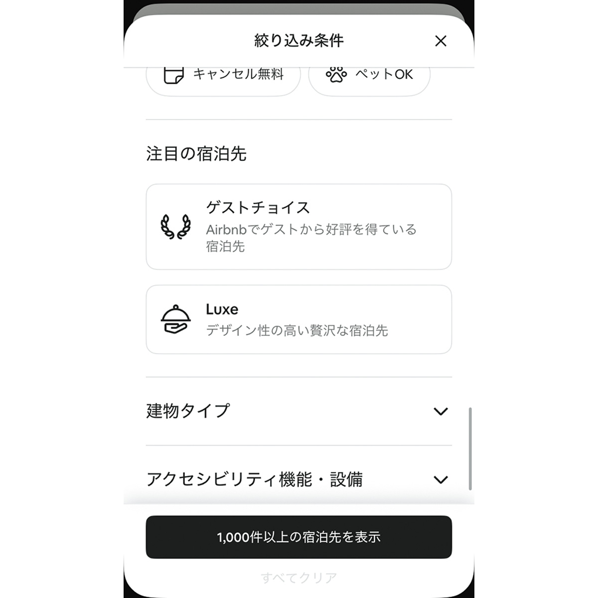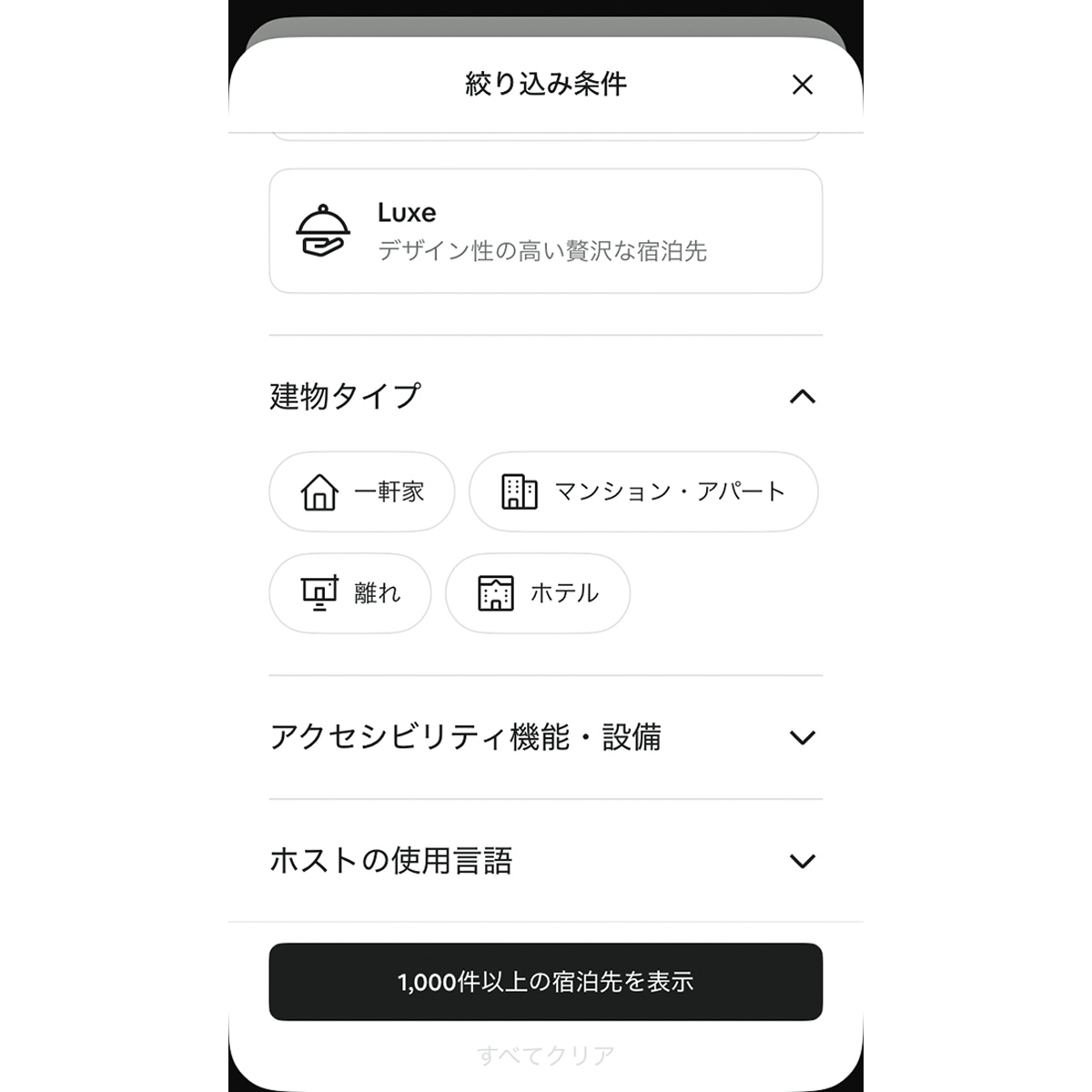「宿泊先をどう探すか」の自由度が高いエアビー。旅の計画が綿密に決まっているなら、目的地から、最寄り駅から、建物タイプからなど、理想により近い宿を絞り込んで検索ができる。