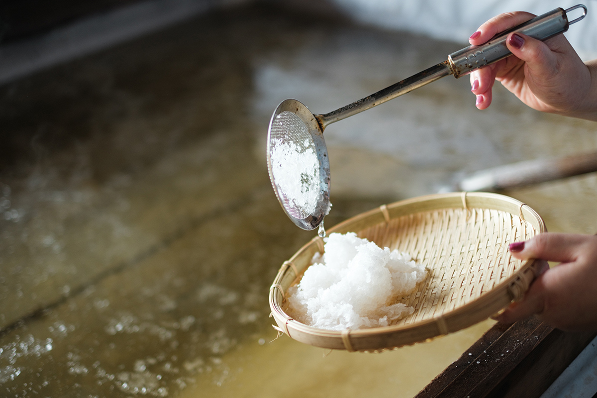 満潮時の海水をポンプで汲み上げ、マイクロフィルターで濾過して不純物を除去。逆浸透膜を使って塩分濃度を高めたら、高さ4メートルもの装置で天日干しさらに凝縮。2つの釜で炊き結晶化した塩を樽へ移し、にがりと一緒に寝かせた後に脱水。粒をそろえてようやく完成。