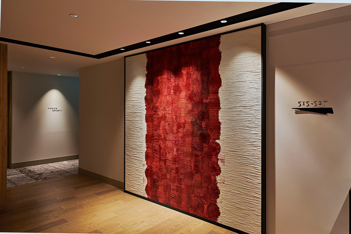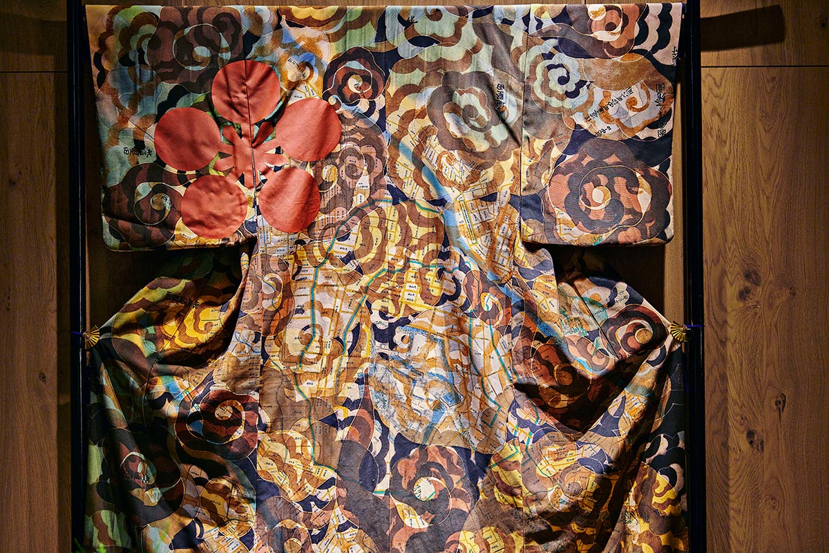 館内には石川・金沢にゆかりがある作品を中心に、100点以上のアートワークが展示されている。例えば、エントランスでゲストを迎える特大アート『野鍛治の門冠 鉄』は、金沢で使われていた鉄の道具を集めて叩いて形を作り、金箔を施したもの。またエレベーター前に飾られている『加賀国金沢之絵図 銹雲唐草』は加賀の古地図と加賀友禅の技術を融合させた作品だ。この2つのように金沢の歴史や伝統を感じさせるものも多く、ひとつひとつ鑑賞しているとまるで美術館にいるような豊かな時間が流れる。