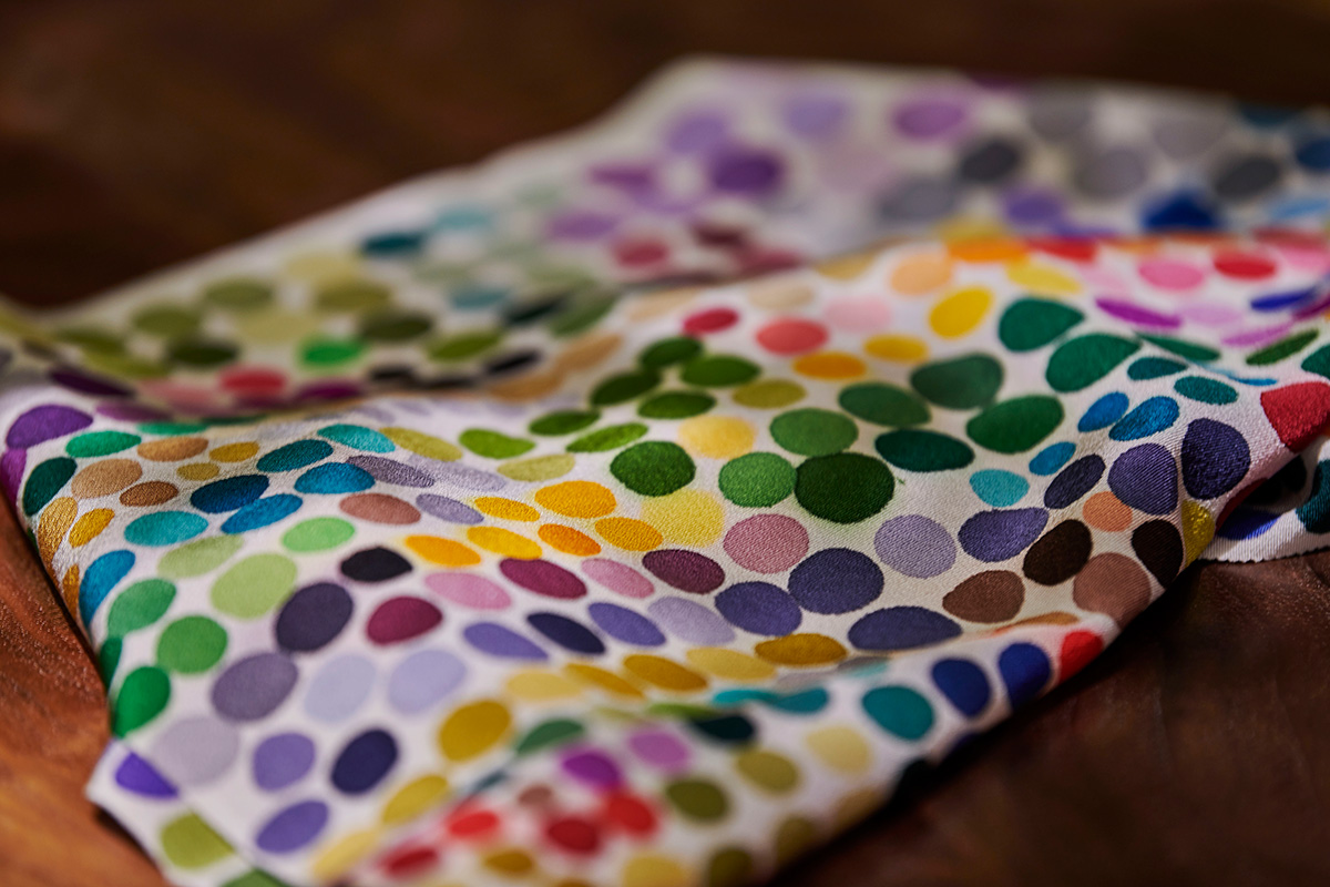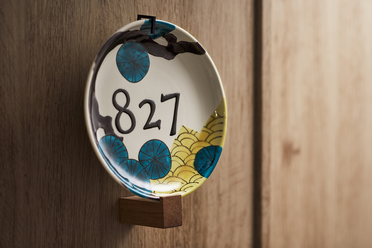 部屋に入ると色鮮やかなヘッドボードが目に入るが、こちらももちろんアート作品。金沢の路傍に和紙を敷いて道をかたどり、その上を歩いた子どもの下駄跡に金箔を施したもの。ほかに飾られている器やテキスタイル、ドア横の部屋番号を記すプレートまで金沢由来の作品で、部屋でも一期一会のアートとの出合いを楽しむことができる。