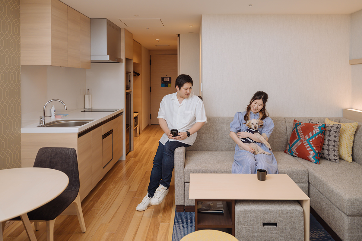〈ハイアット ハウス 金沢〉の大きな特徴は、92室のゲストルーム中78室にキッチンや調理道具が備えられ、ドッグフレンドリーな部屋があるなど、長く滞在する人におすすめのレジデンスタイプのホテルであること。昼は街を散策し、夜は市場で刺身を購入して地酒で軽めに……など、まるでこの街に暮らしているような、より自由度の高い滞在が楽しめる。