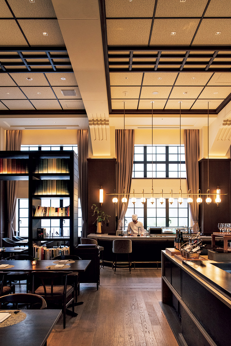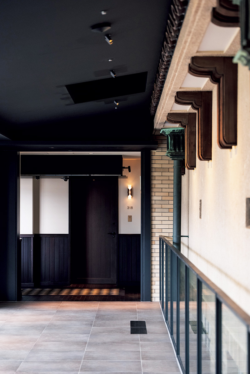 建築デザイン監修は数々のホテルや食空間を手がけるA.N.D.。改修では外装だけでなく、内部装飾や手摺りの傷跡にいたるまで、在りし日の記憶の断片も大切に受け継がれた。また開業にあたり、東山の名所、八坂の塔の景観を間近で堪能できる新棟を増築。外壁は影色で統一され、歴史ある既存棟を際立たせる黒子としての役割も担う。
