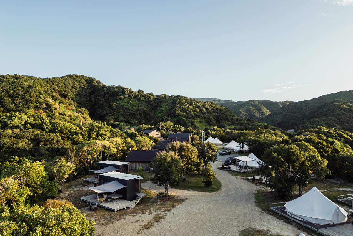 ツアーでの宿泊は、国立公園・志原海岸の敷地内に位置するグランピング施設〈In the Outdoor 白浜志原海岸〉。施設全体が森に囲まれていて、海を見下ろすロケーションが非日常へと誘う。