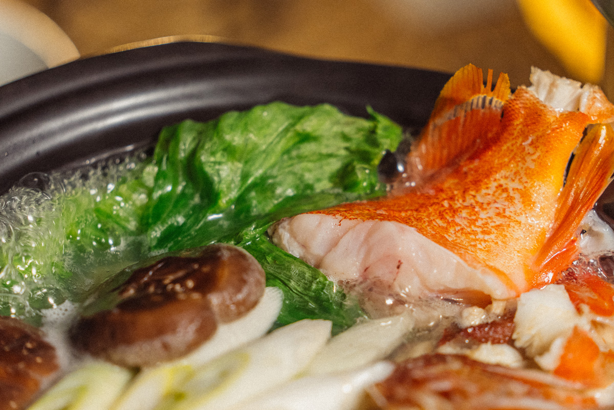 漁師町ならではの一品が、日置名産のアカハタをまるごと使った鍋。骨ごとぶつ切りにして鍋に入れることで、いいおダシも出るそう。ほろっとやわらかな身は、地元名産の柑橘を使った、じゃばらポンズとみかんポンズをお好みで。「日置エリアの海は荒磯だから、魚の身がひきしまっていておいしい」と、漁師さんが教えてくれた。魚の旨みがたっぷり溶けだしたダシでいただくレタスしゃぶしゃぶも美味。鍋のシメは、地元産コシヒカリで雑炊に。紀州南高梅と一緒に味わうと、酸味がさらに食欲を加速させる。
