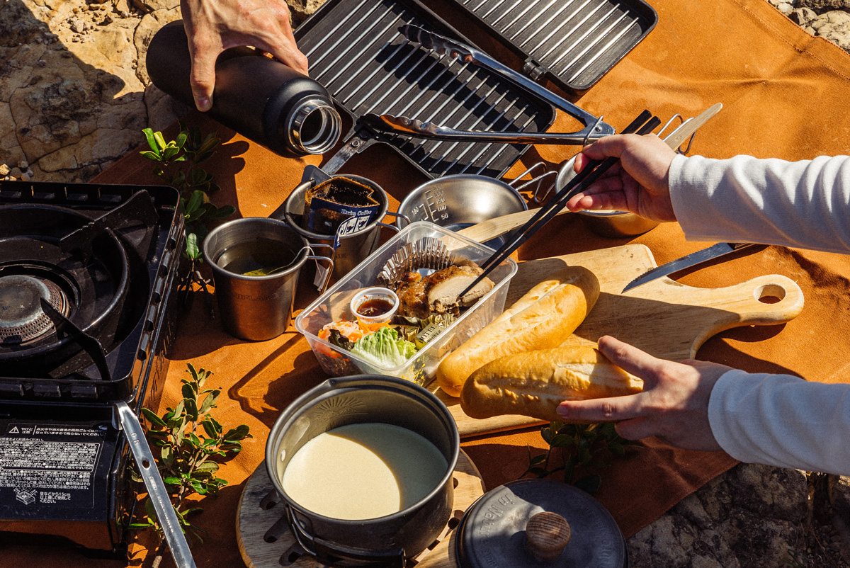 国立公園内にある〈In the Outdoor 白浜志原海岸〉らしい、朝食スタイルも楽しみ。アウトドア用の調理器具とピクニックセットを持って、好みのスポットを探そう。おすすめは、志原海岸を一望できる展望台。