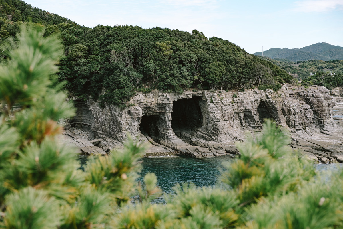 宿泊施設の周辺には、壮大なジオサイトがある。波の力で平に浸食された岩が連なる〈志原の千畳敷〉や、波の浸食で岸壁にできた2つの海食洞〈鳥毛洞窟〉は、歩いてアクセスすることが可能。朝活がてら足をのばし、大自然が作りあげた圧倒的なスケールの景色を眺めるのもいい。*洞窟内は崩落の危険性があるため、立ち寄り時にはご注意ください。