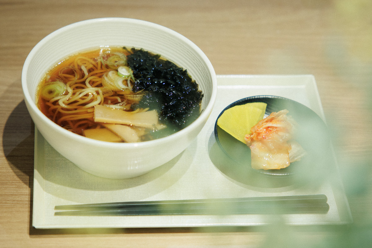 〈ドーミーイン〉名物の一つ「夜鳴きそば」。日本と同じレシピの醤油ラーメンがうれしい。キムチとたくあんも。21:00~22:30。