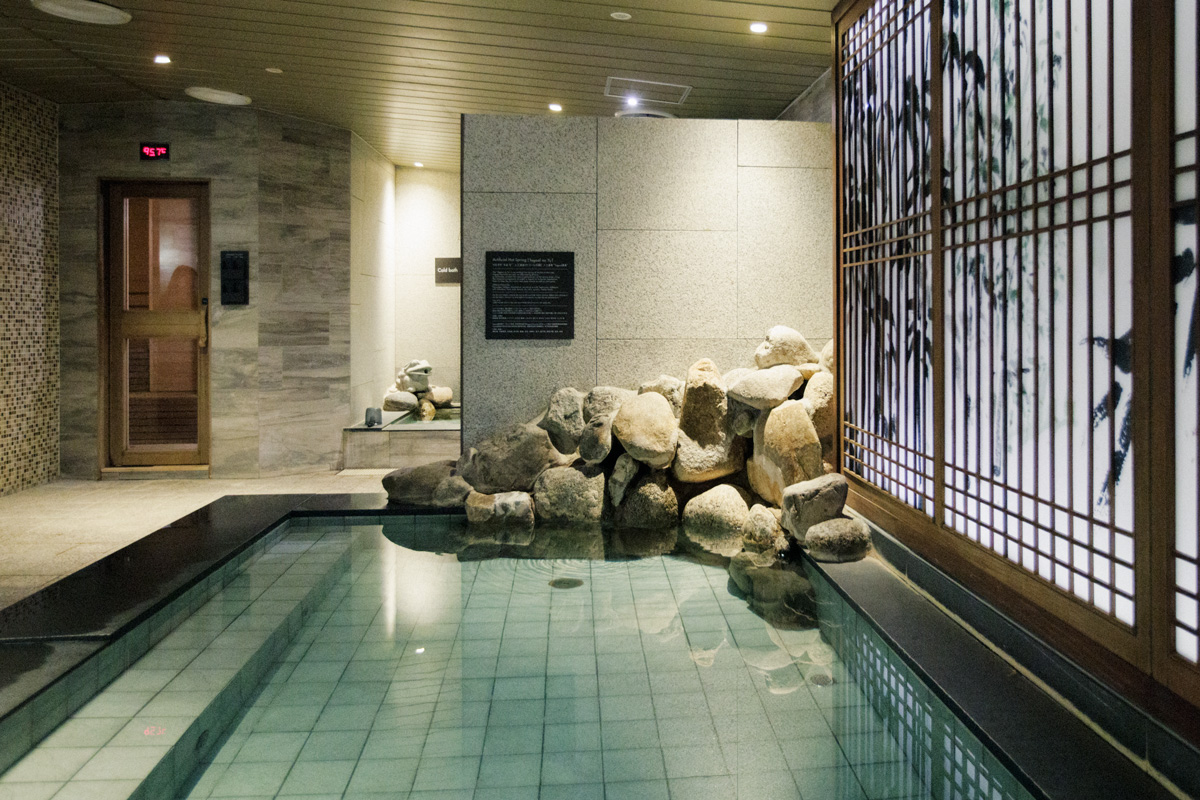 旅館のような和テイストの大浴場。内湯、壺風呂、サウナ、水風呂を完備。15:00から翌10:00まで入浴可なので、帰りが遅くても安心。