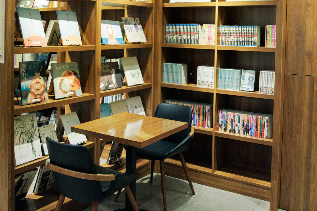 公式HPからの宿泊予約で利用できるラウンジ。日韓の人気書店がセレクトした本を読んだり、マッサージ機で疲れを癒したり。